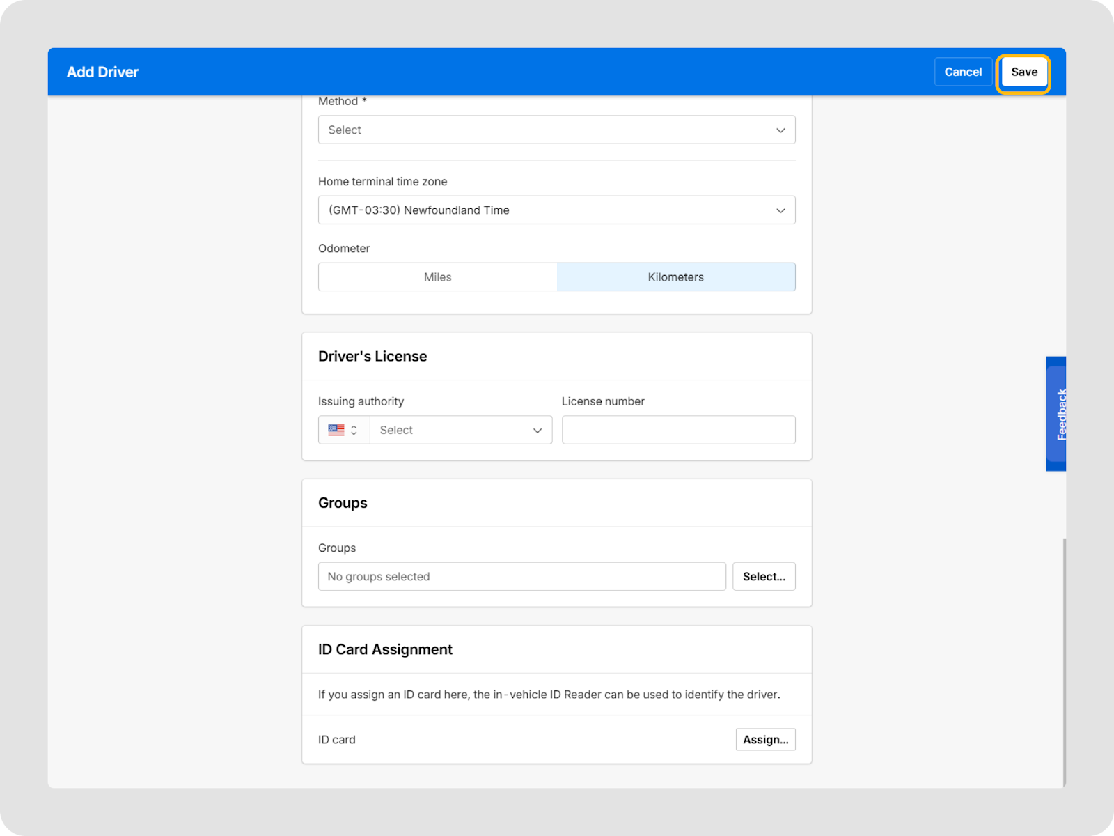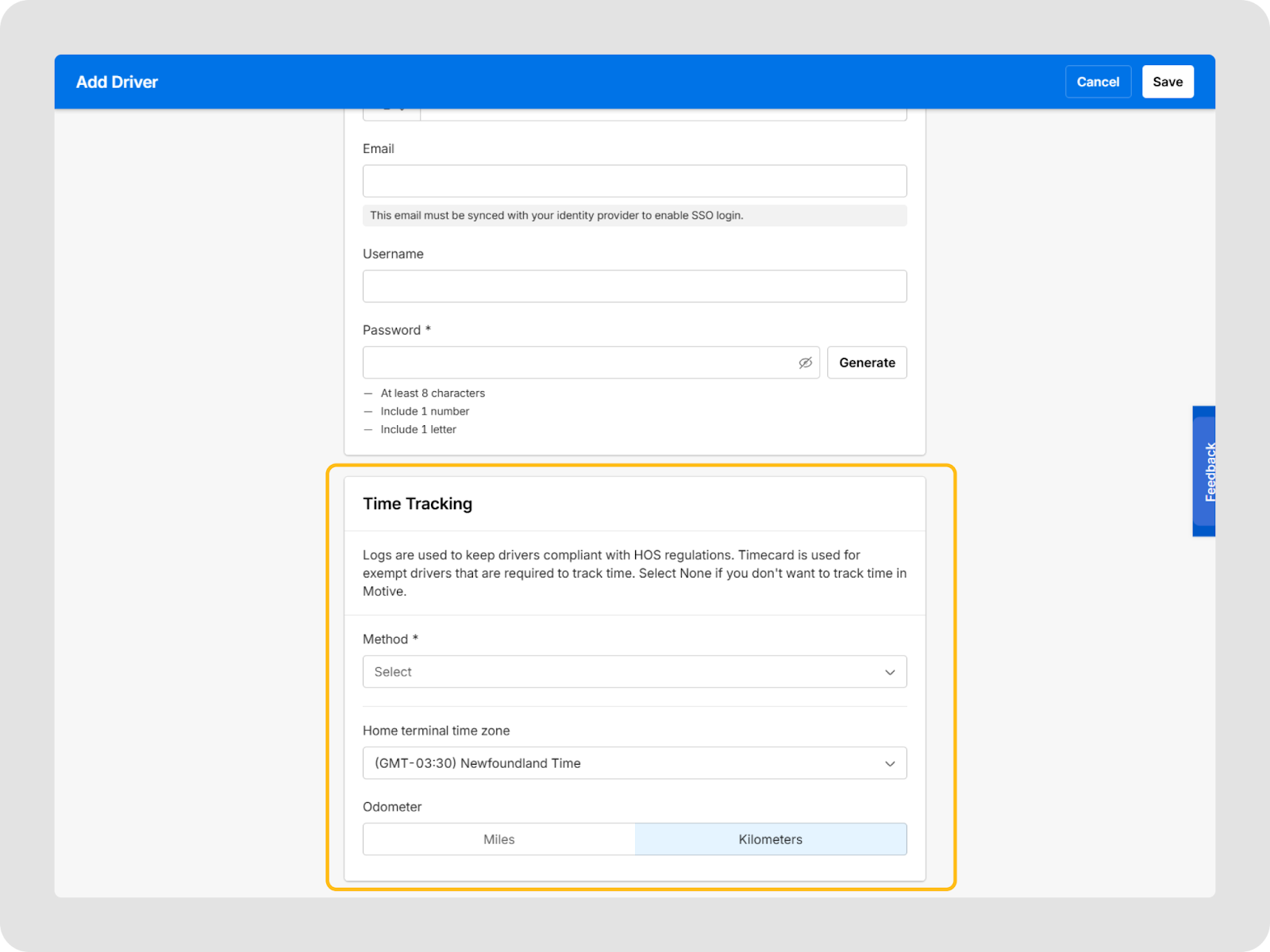 Entrez les détails de Suivi du temps tels que la Méthode, le fuseau horaire du terminal domicile, et les informations du odomètre. Si Journaux est sélectionné comme Méthode, vous devez entrer des informations supplémentaires, telles que l’autorité DOT, le nom du transporteur, l’adresse du bureau principal et l’adresse du terminal domicile. Si Carte de temps est sélectionné comme Méthode, vous devez ajouter un motif d’exemption dans le menu déroulant.