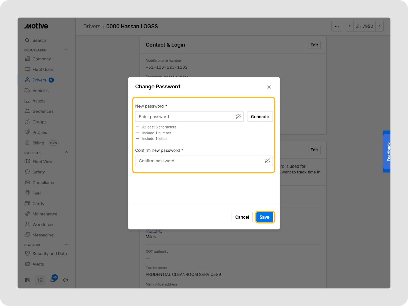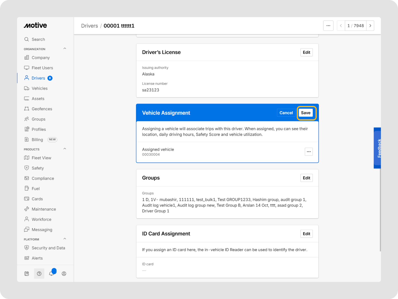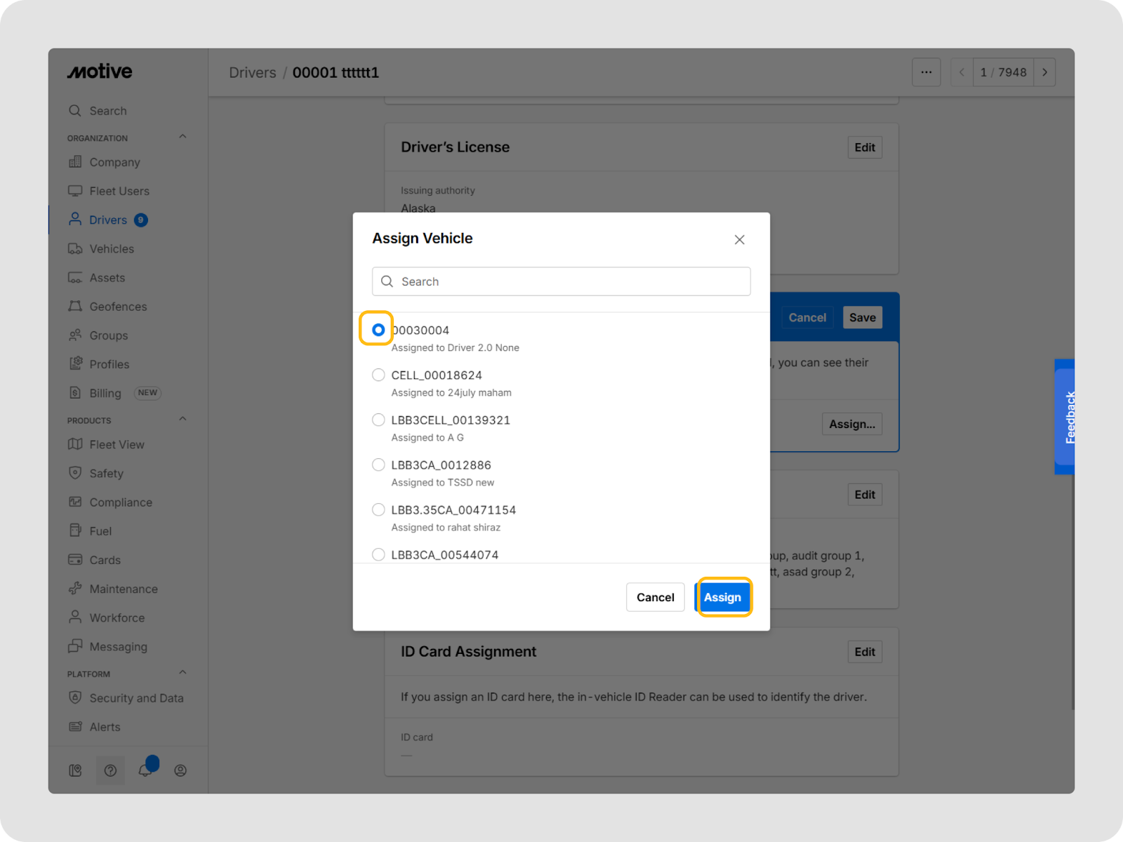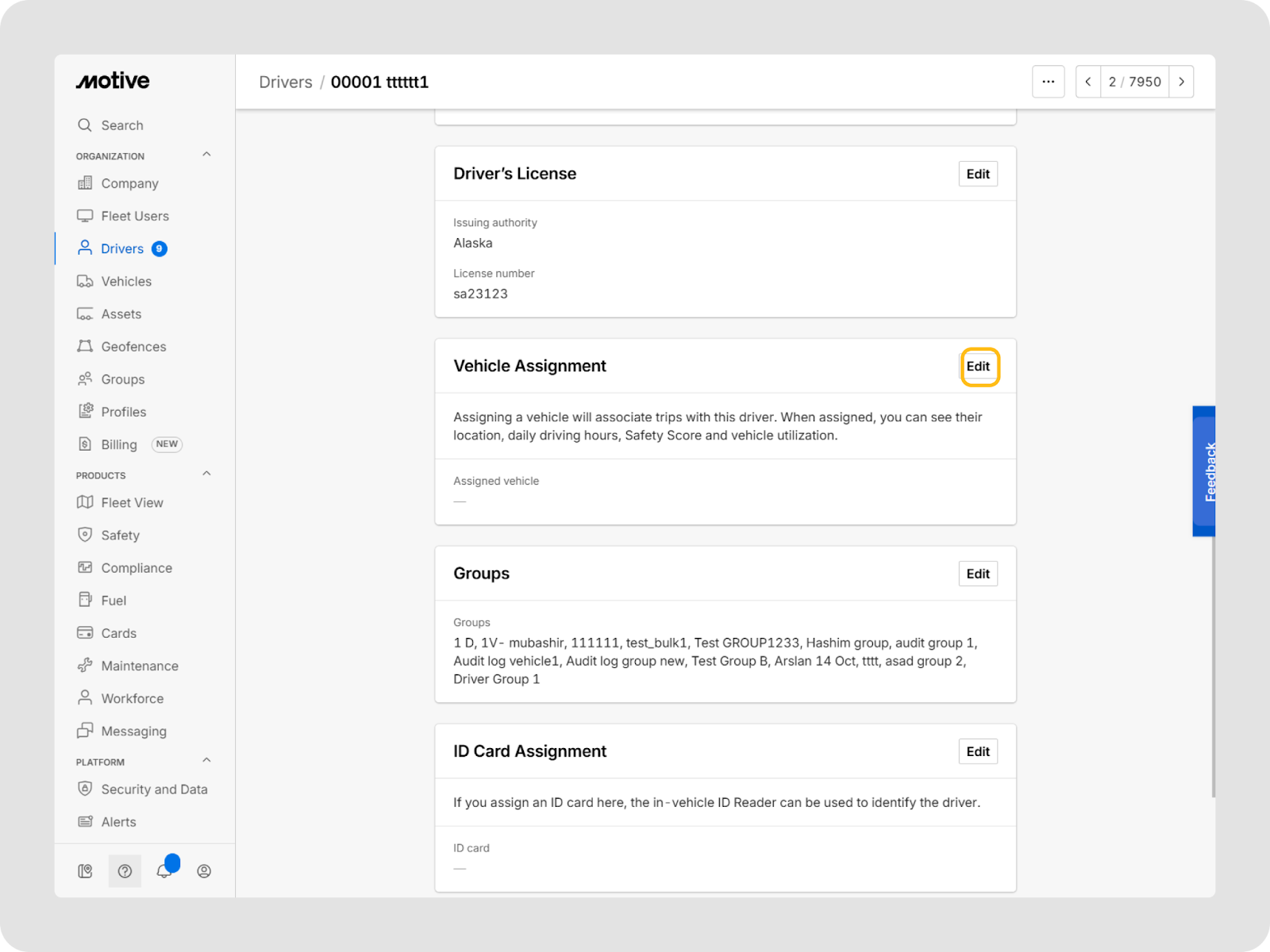 Vous pouvez mettre à jour les informations d’un conducteur à tout moment dans le tableau de bord Motive Fleet.