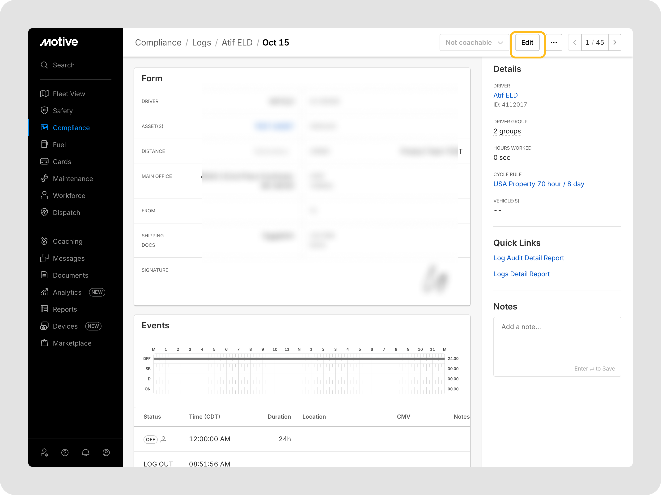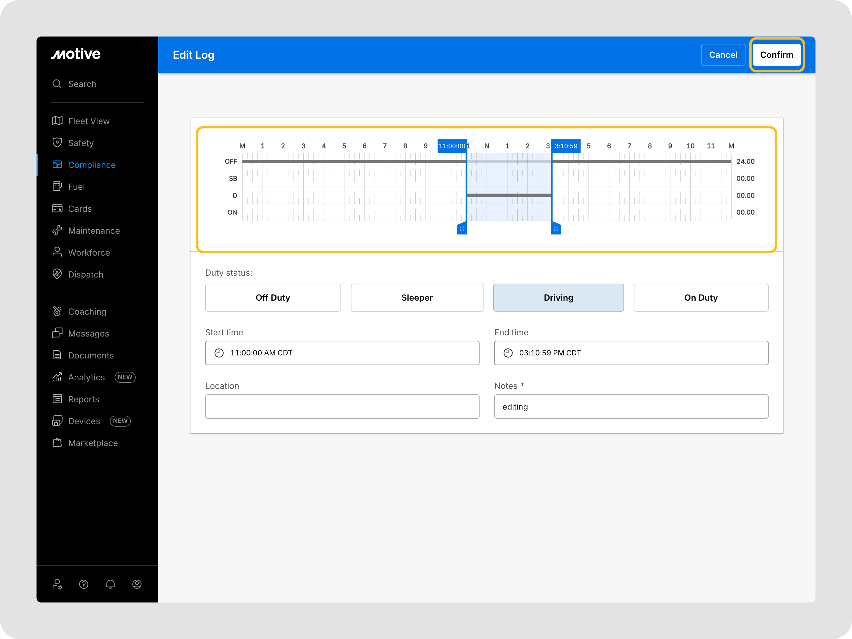 Pour garantir l'exactitude et la conformité des journaux, tant les conducteurs que les utilisateurs de flotte peuvent apporter des modifications aux enregistrements des heures de service (HOS). Cet article explique comment modifier les journaux, suggérer des changements et les approuver sur la plateforme Motive.