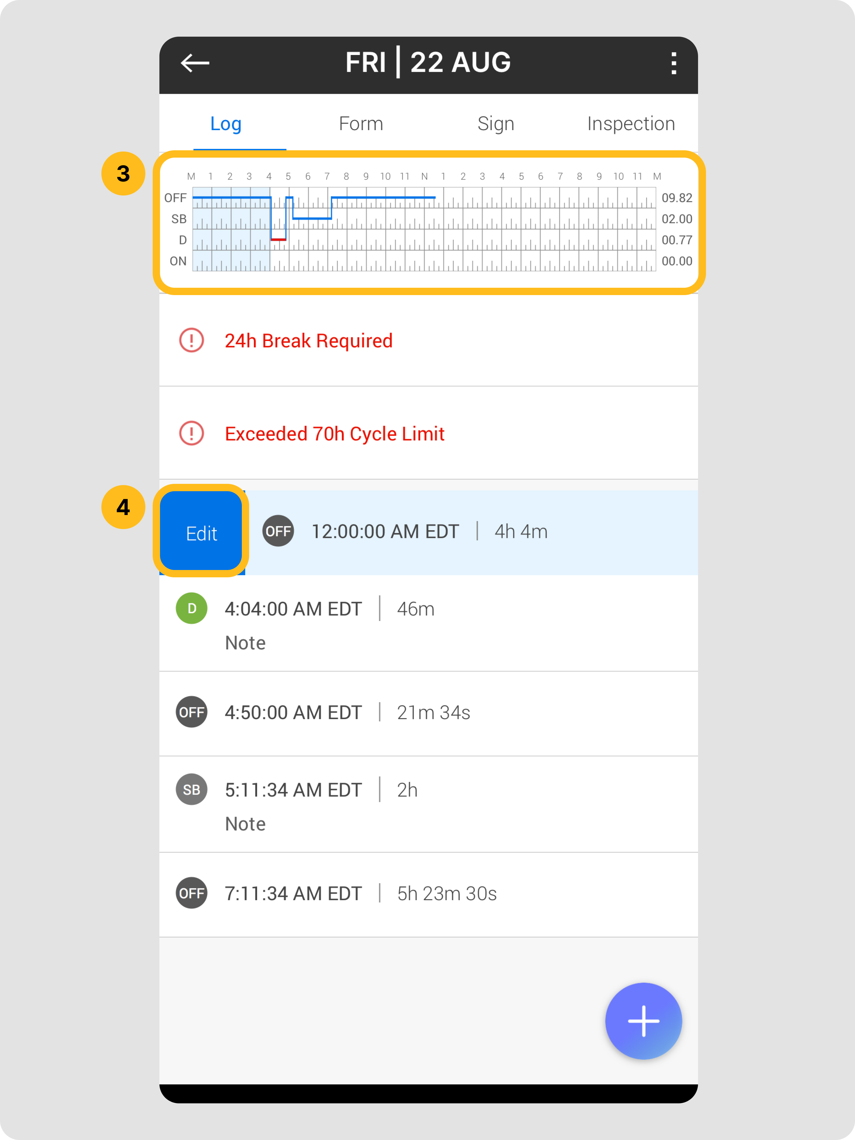 - Modifications initiées par le conducteur : Les conducteurs peuvent modifier directement leurs propres journaux pour corriger des erreurs. Cela inclut le changement d'un statut de service, l'insertion d'un statut de service passé qui avait été omis, ou l'ajout de notes.