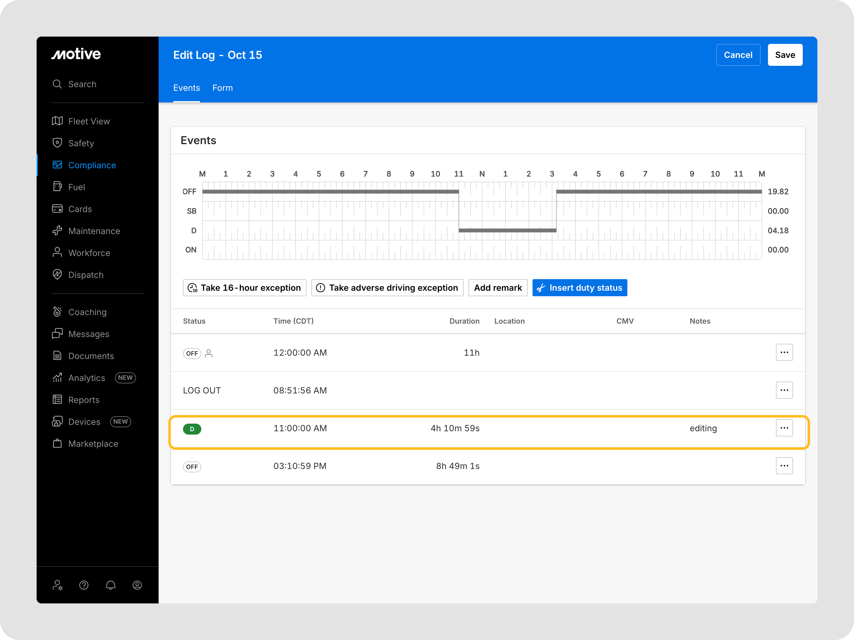 Assurer l'exactitude du carnet de bord est une responsabilité partagée entre les conducteurs et les gestionnaires de flotte. Motive offre un flux de travail collaboratif pour corriger les erreurs ou ajouter des informations manquantes aux journaux d’un conducteur. Ce processus est conçu pour être entièrement conforme aux réglementations de la Federal Motor Carrier Safety Administration (FMCSA), qui exigent une traçabilité claire et une certification du conducteur pour toutes les modifications.