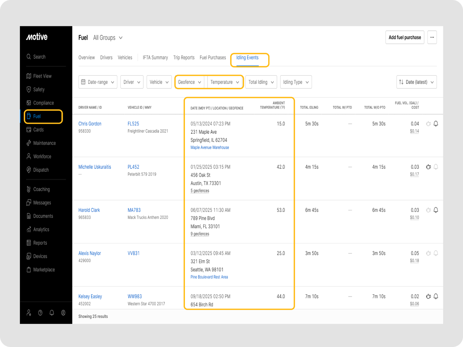 Un ralenti excessif augmente les coûts cachés de carburant et les émissions dans toute votre flotte. Le rapport Événements de ralenti de Motive aide à surveiller le temps de ralenti, réduire le gaspillage et soutenir les objectifs de durabilité.