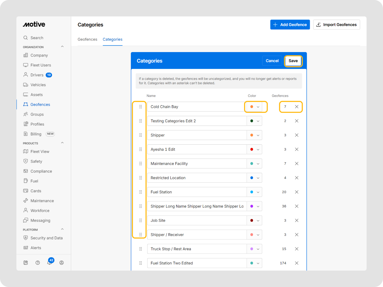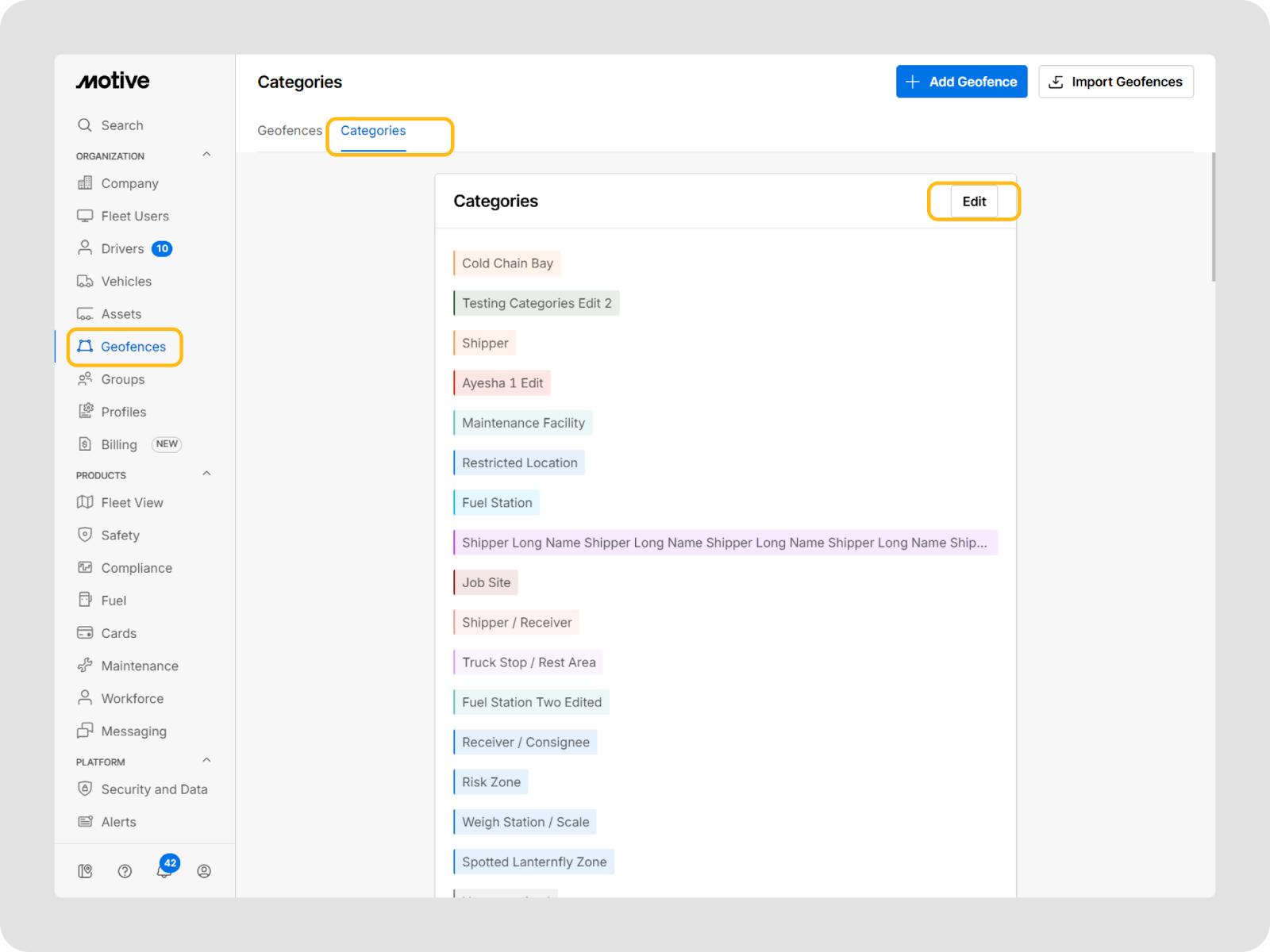 - Connectez-vous au tableau de bord de flotte Motive et allez à Géorepères > Catégories pour voir votre liste actuelle d'étiquettes de géorepères.