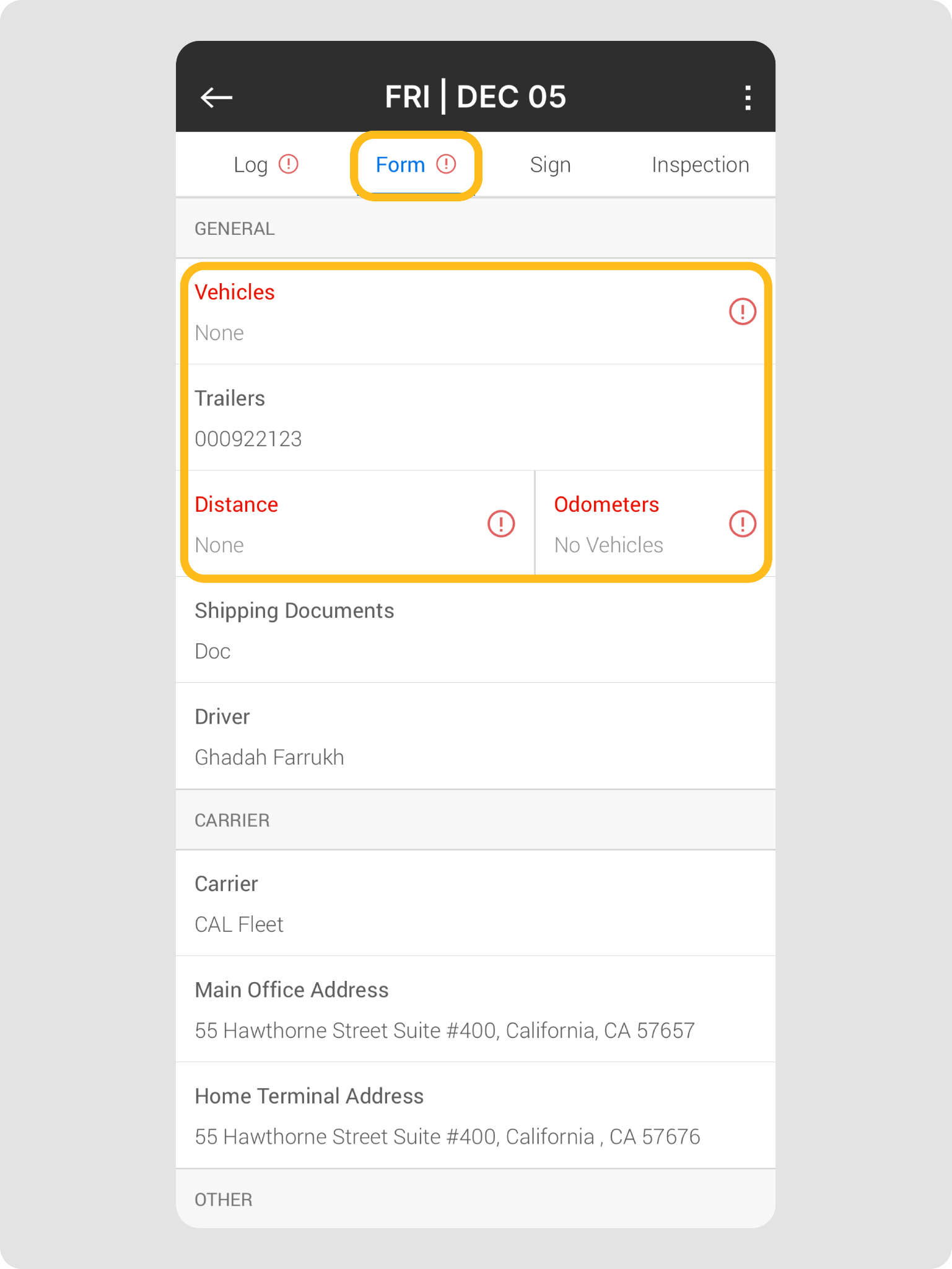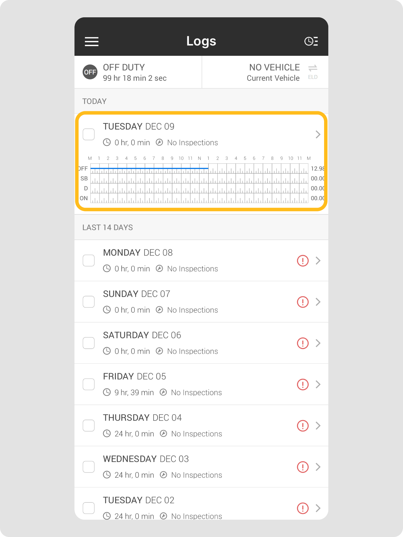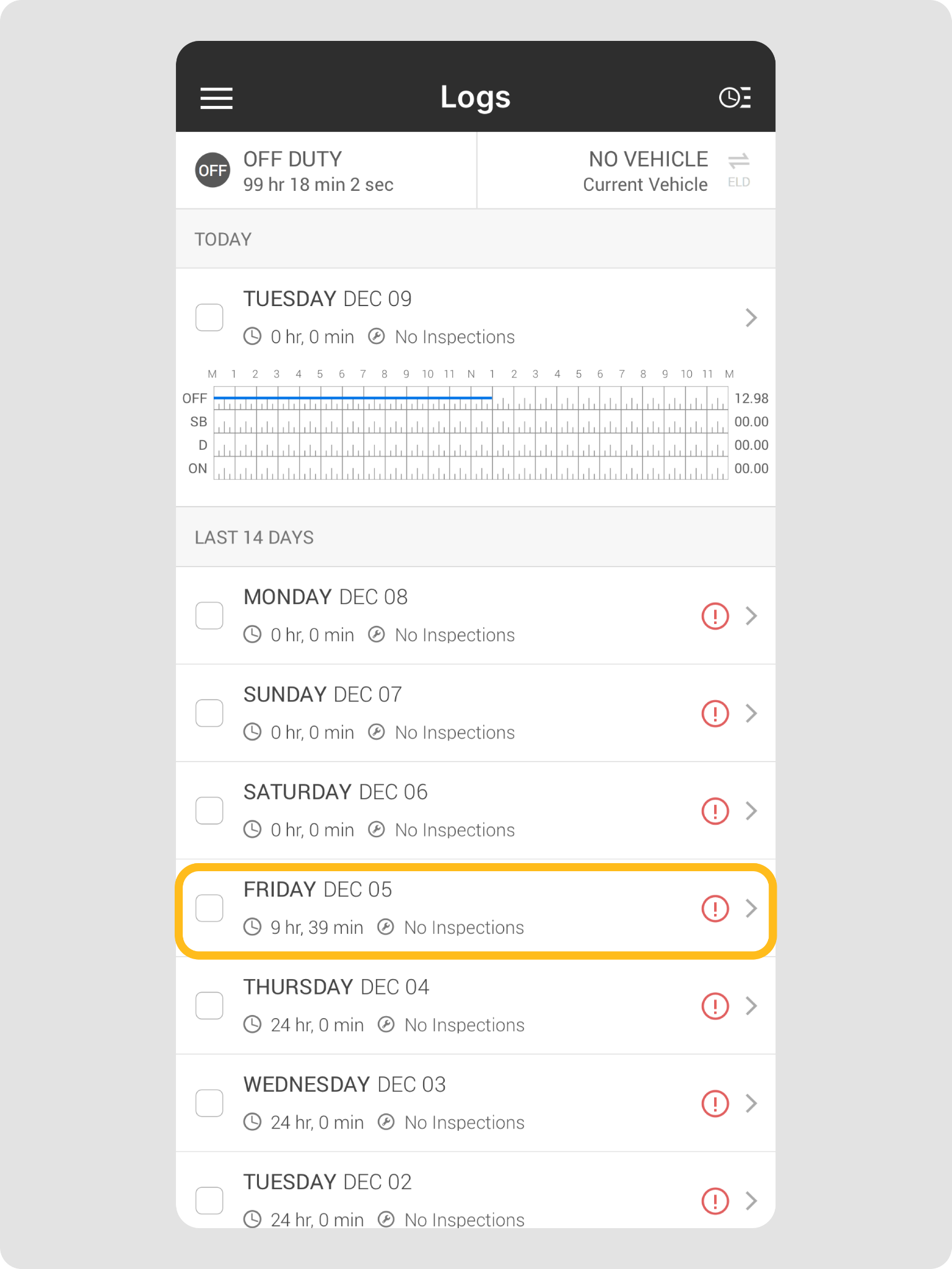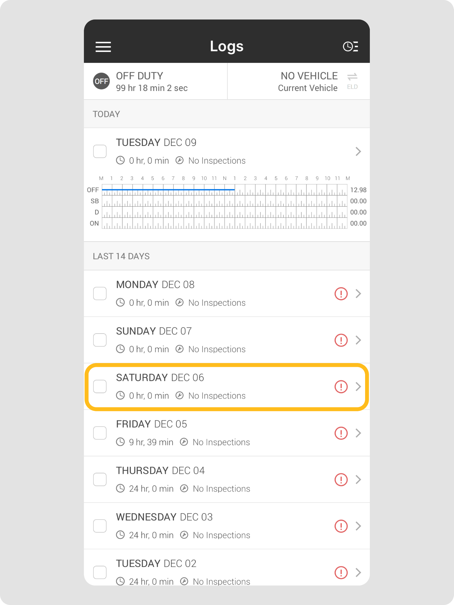 - Depuis l'écran Journaux , appuyez sur tout journal avec un point d'exclamation rouge (!). Ce symbole indique des journaux avec des erreurs de forme et de manière ou des violations HOS.