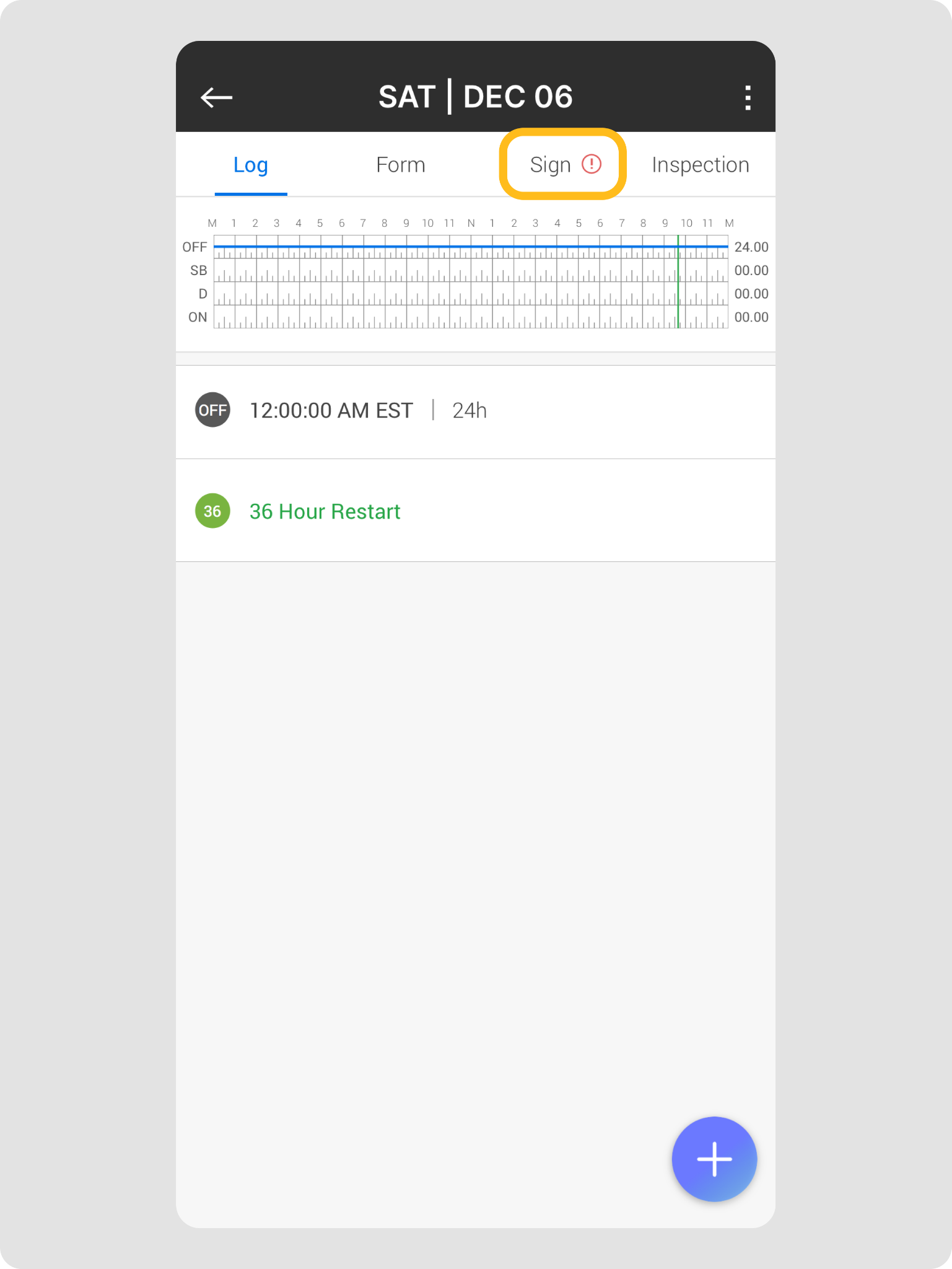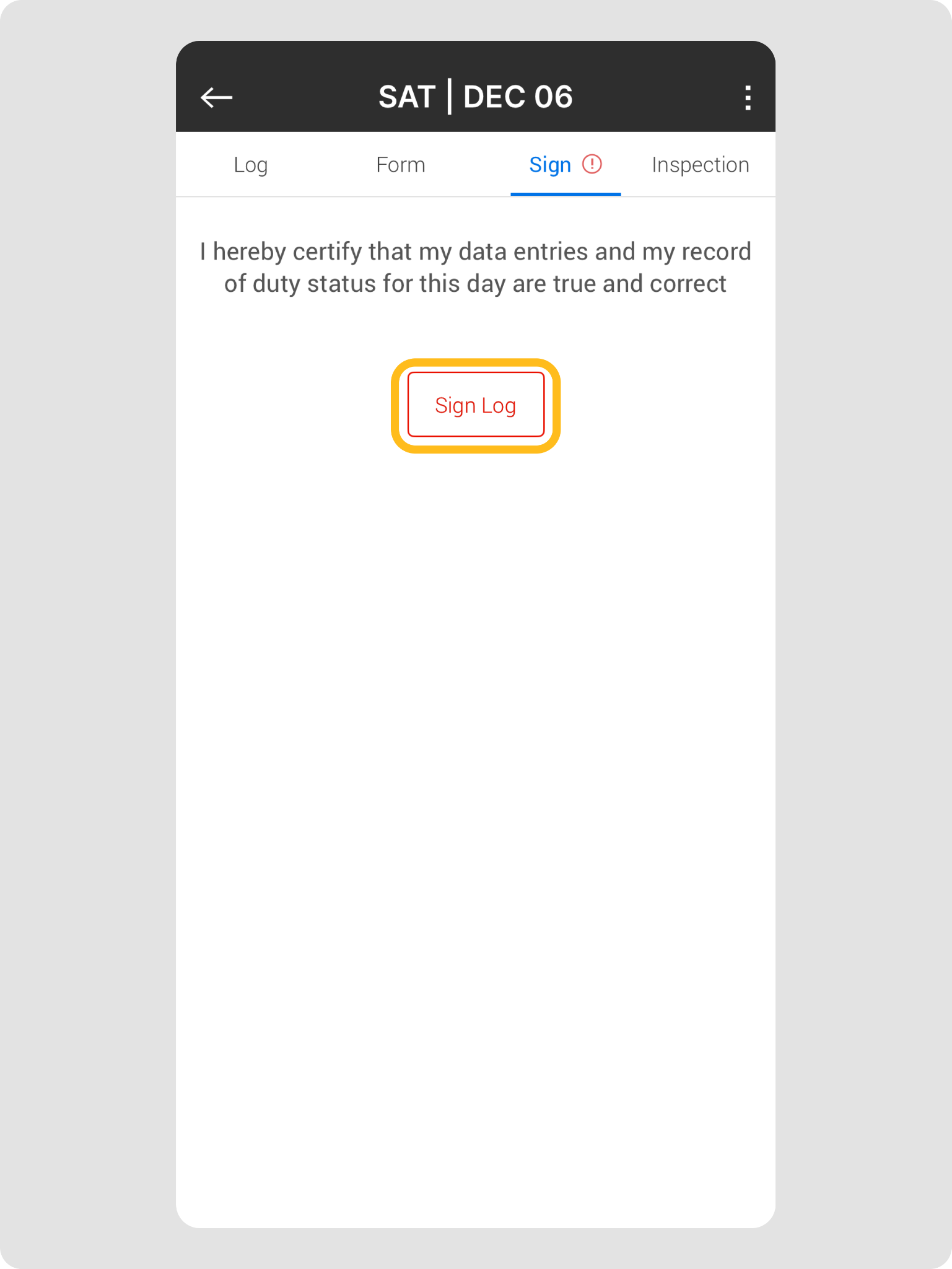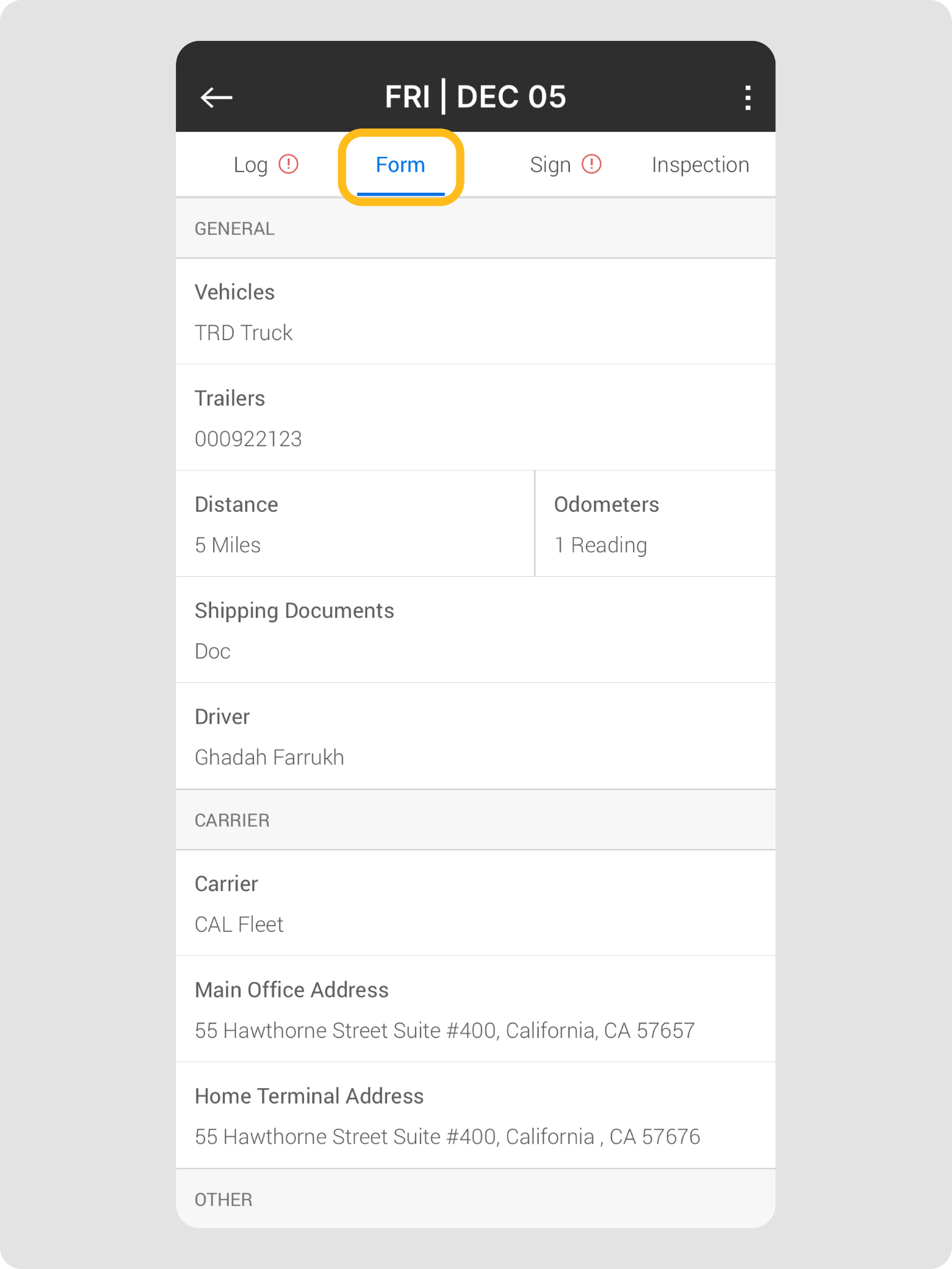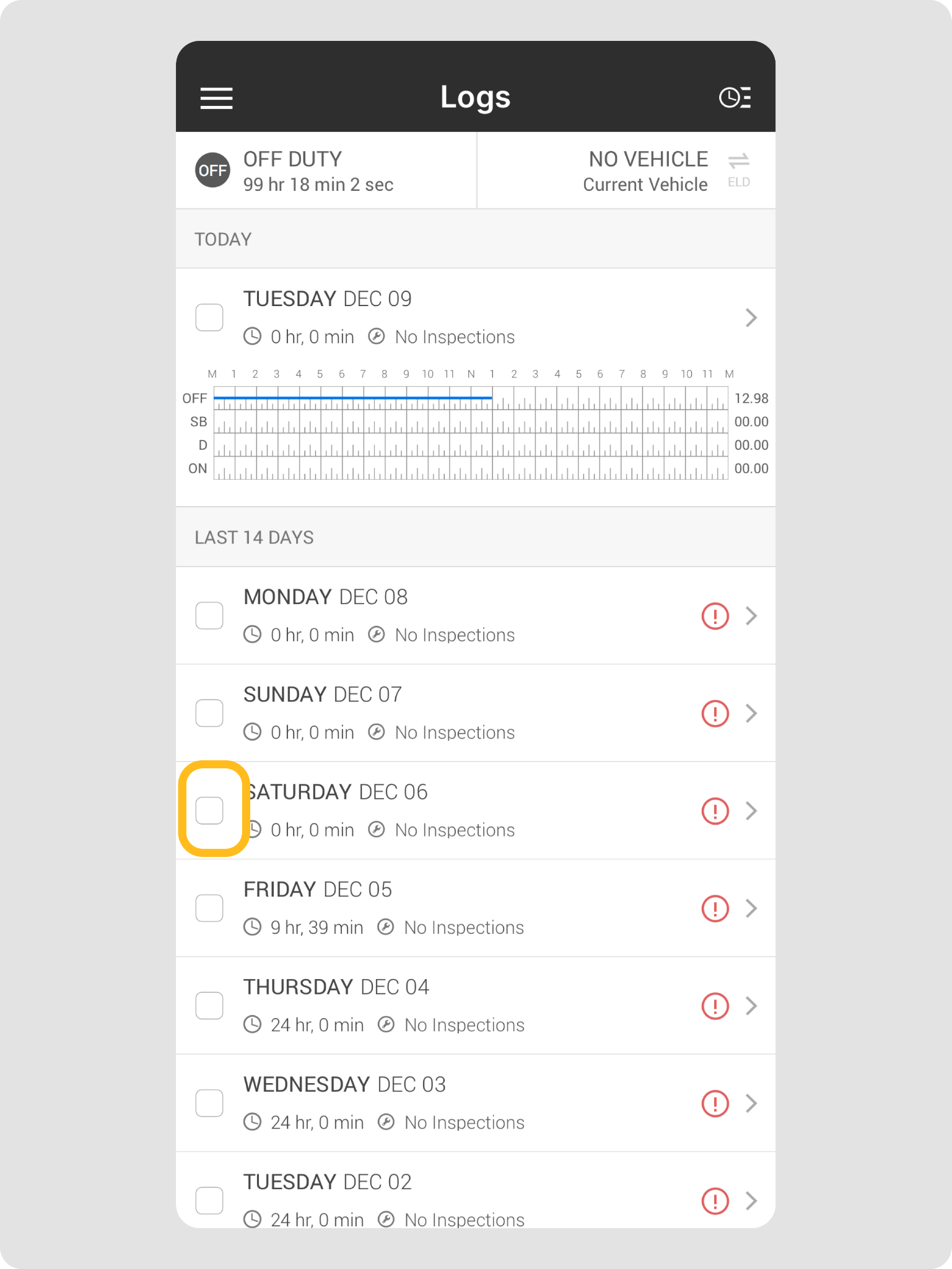 - Depuis l'écran Journaux , appuyez sur tout journal avec un point d'exclamation rouge (!). Ce symbole indique des journaux avec des erreurs de forme et de manière ou des violations HOS.