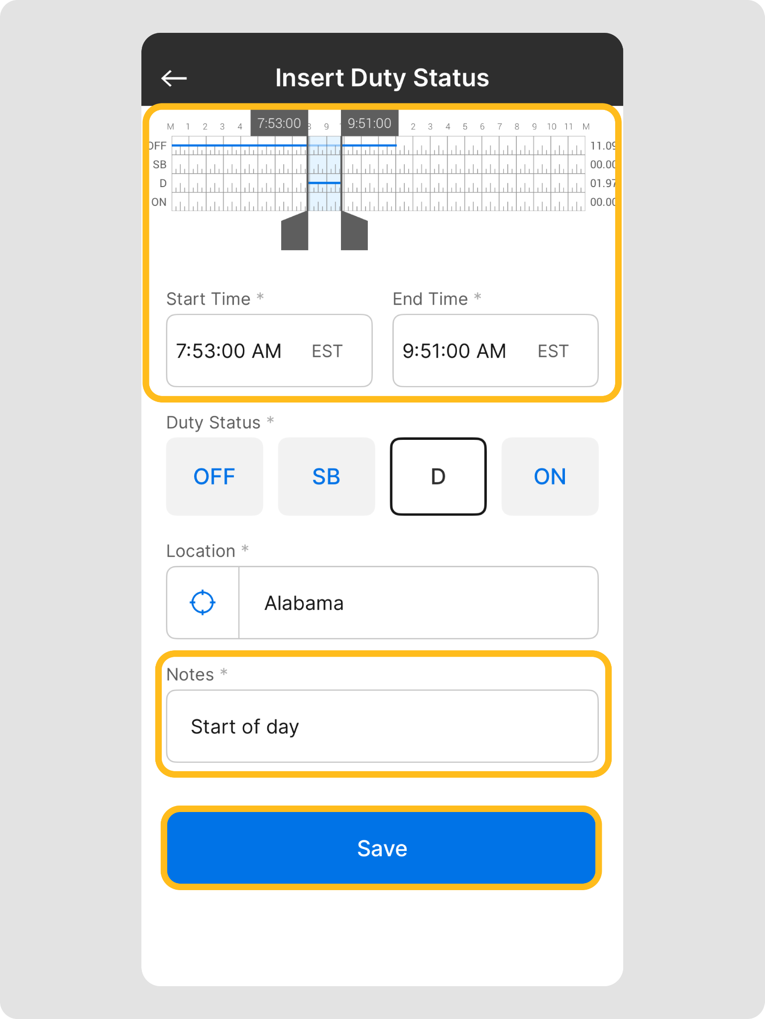 | Remarque : Le temps de conduite est enregistré automatiquement et ne peut pas être modifié par la suite. Si votre gestionnaire de flotte suggère une modification, vous recevrez une invite pour Approuver ou Rejeter le changement. Toutes les modifications doivent inclure une raison pour rester conforme aux réglementations sur les dispositifs d'enregistrement électronique (ELD). |