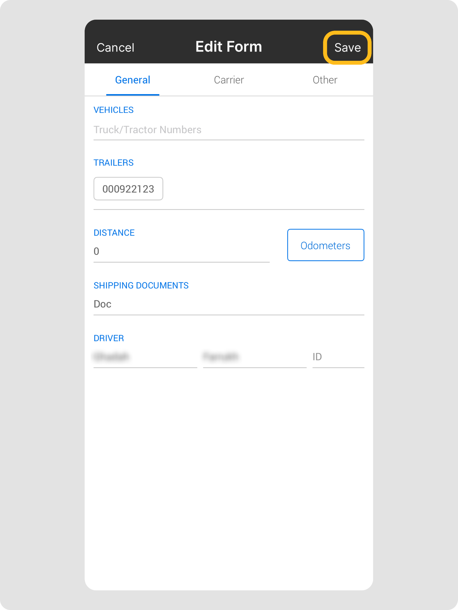 | Remarque : Si vous utilisez la passerelle Motive Vehicle, les champs Distance et Odomètres se rempliront automatiquement à la fin de la journée. |