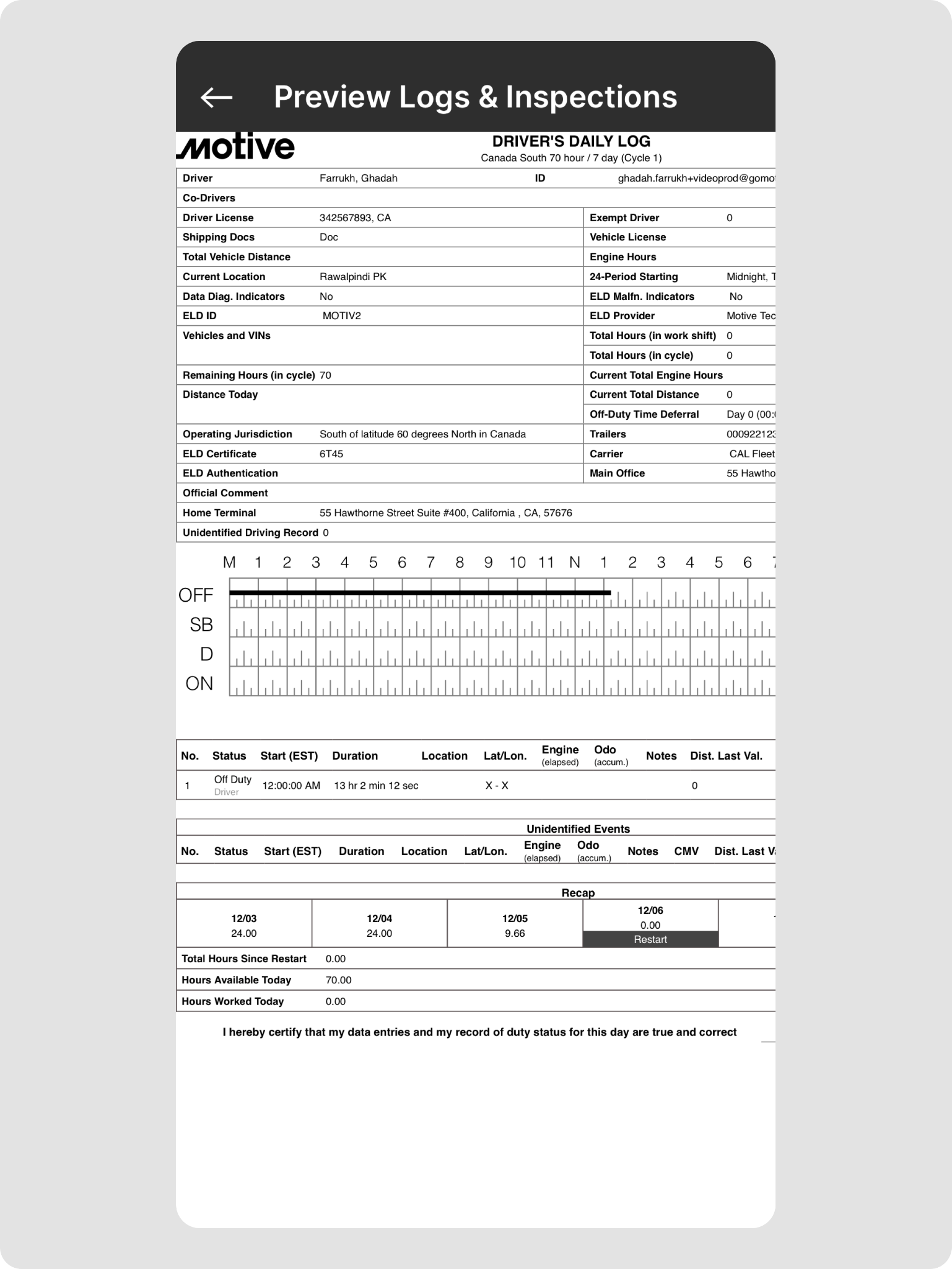 L'application Motive Driver facilite la visualisation, la modification, la certification et le partage de vos journaux HOS. Grâce à son interface intuitive, vous pouvez gérer vos journaux efficacement, rester conforme et simplifier le processus d'inspection. Les principales fonctionnalités comprennent :