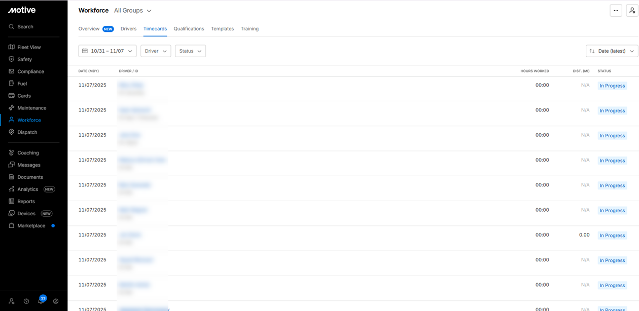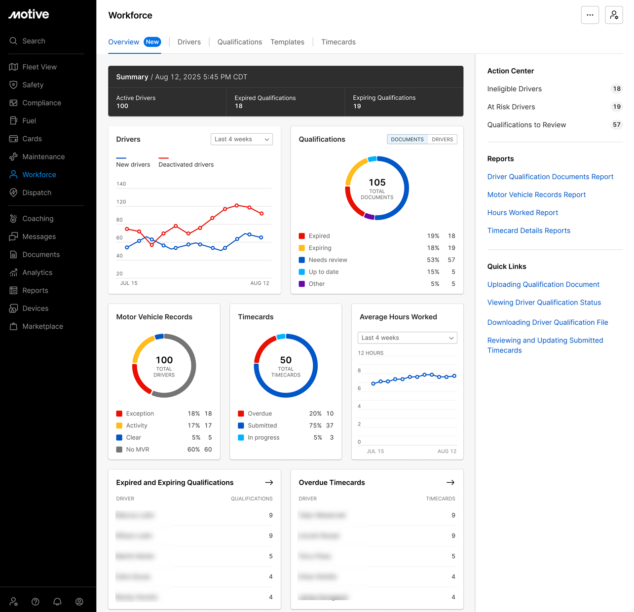 C’est une page d’aperçu centralisée dans la section Main-d’œuvre du tableau de bord de la flotte qui affiche des informations et actions sur la main-d’œuvre, y compris les données des feuilles de temps et des qualifications des conducteurs, le tout en un seul endroit.
