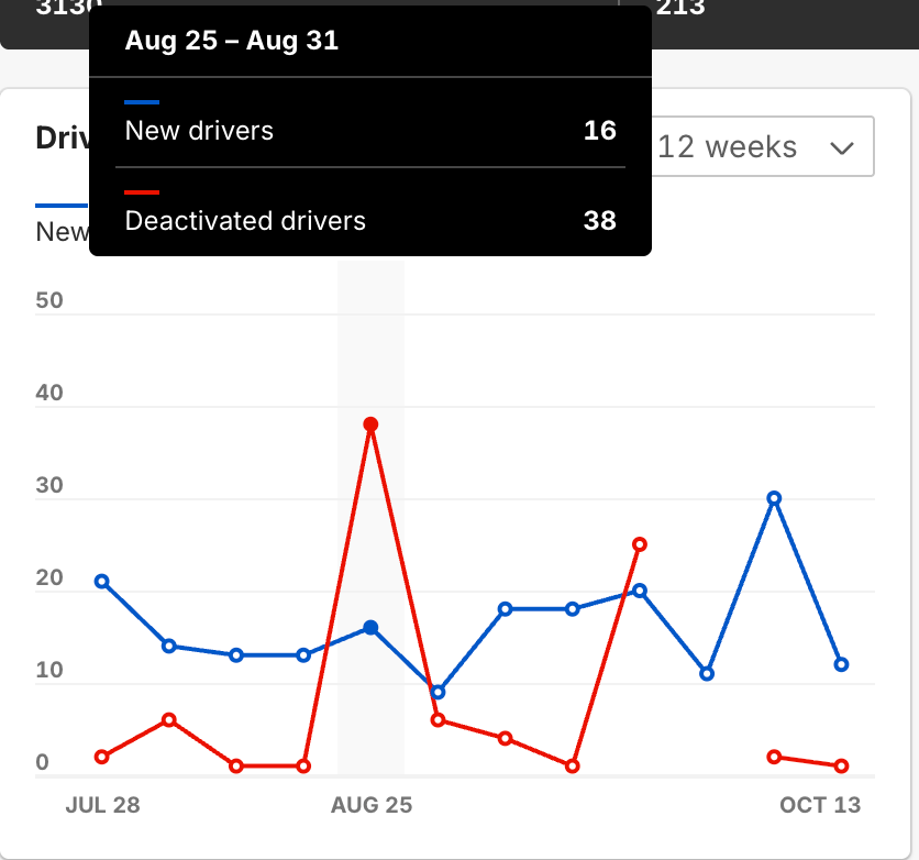 Le widget Conducteurs affiche la tendance des conducteurs nouveaux et désactivés au sein de la flotte selon la période sélectionnée par l’utilisateur de la flotte (par exemple, la semaine dernière, les 4 dernières semaines, les 12 dernières semaines).