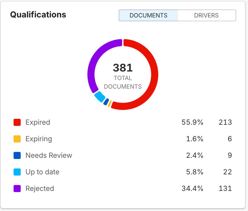 Le widget Qualifications affiche les qualifications des conducteurs par statut de document et de conducteur.
