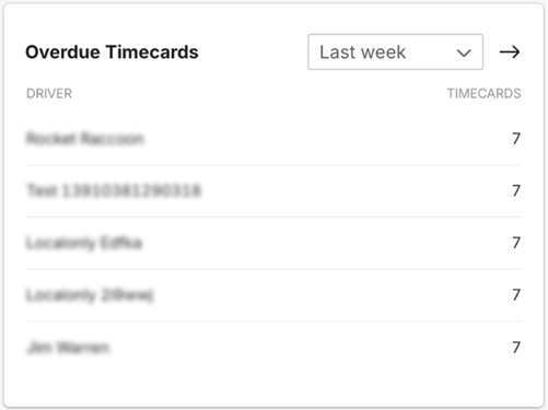 - Cliquez sur la flèche en haut à droite du widget pour accéder à l’onglet Main-d’œuvre > Feuilles de temps, préfiltré pour afficher tous les conducteurs avec des feuilles de temps en retard pour la période sélectionnée dans le widget.