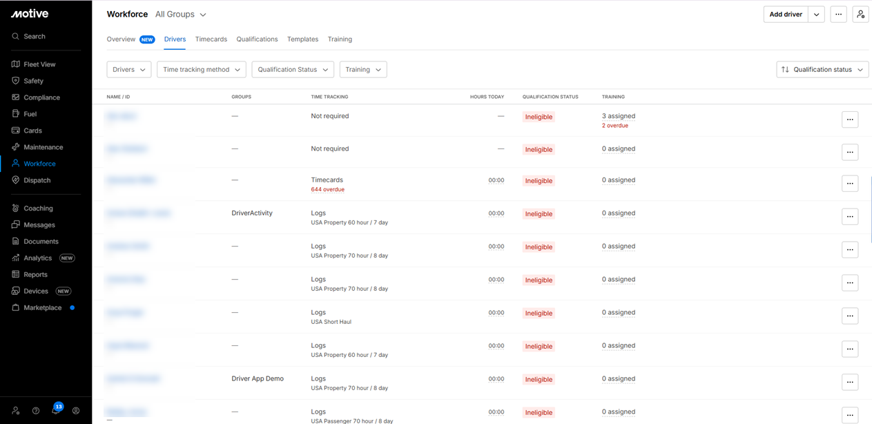 Cet onglet vous aide à gérer tous les profils de conducteurs avec des actions rapides et des filtres pour le suivi du temps et le statut des qualifications afin de simplifier les opérations quotidiennes.