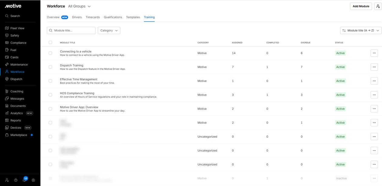 Cet onglet vous aide à créer et gérer des modules de formation au sein de Motive. Vous pouvez attribuer un ou plusieurs modules de formation aux conducteurs ou groupes sélectionnés et suivre les progrès.