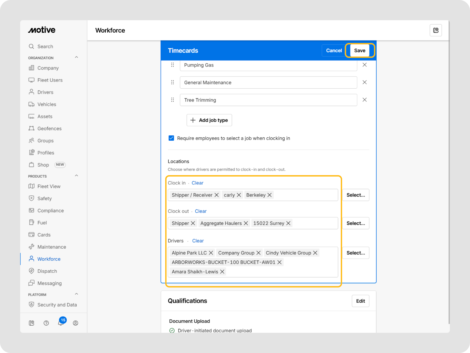 - Sélectionnez Exiger que les employés sélectionnent un travail lors du pointage si vous souhaitez que les conducteurs sélectionnent un travail avant de pointer.