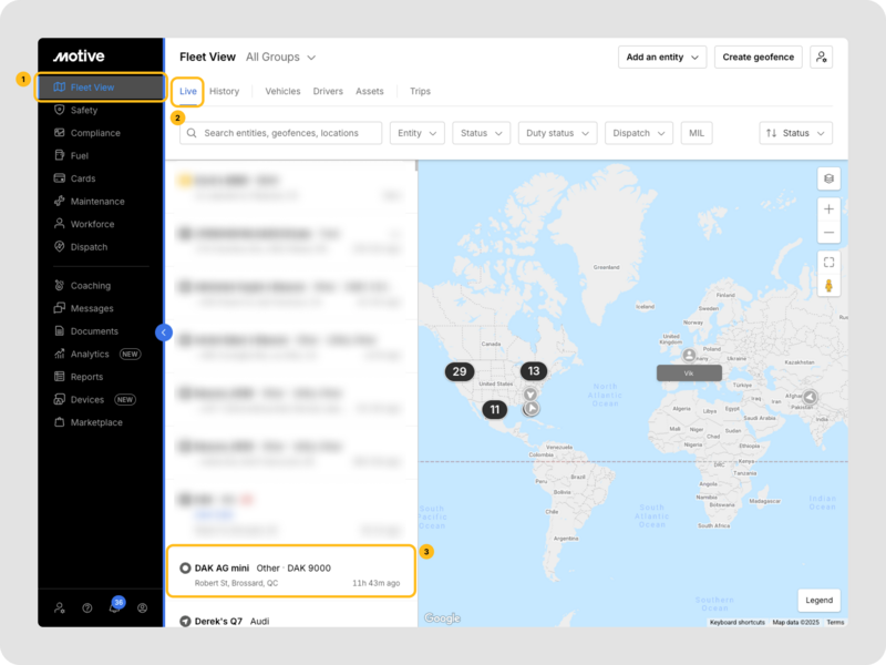 - Allez à Vue de flotte > En direct dans le tableau de bord de flotte