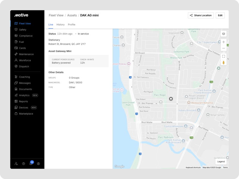 - Vue complète : Consultez les données complètes de trajets, d’arrêts et des capteurs pour n’importe quel actif.