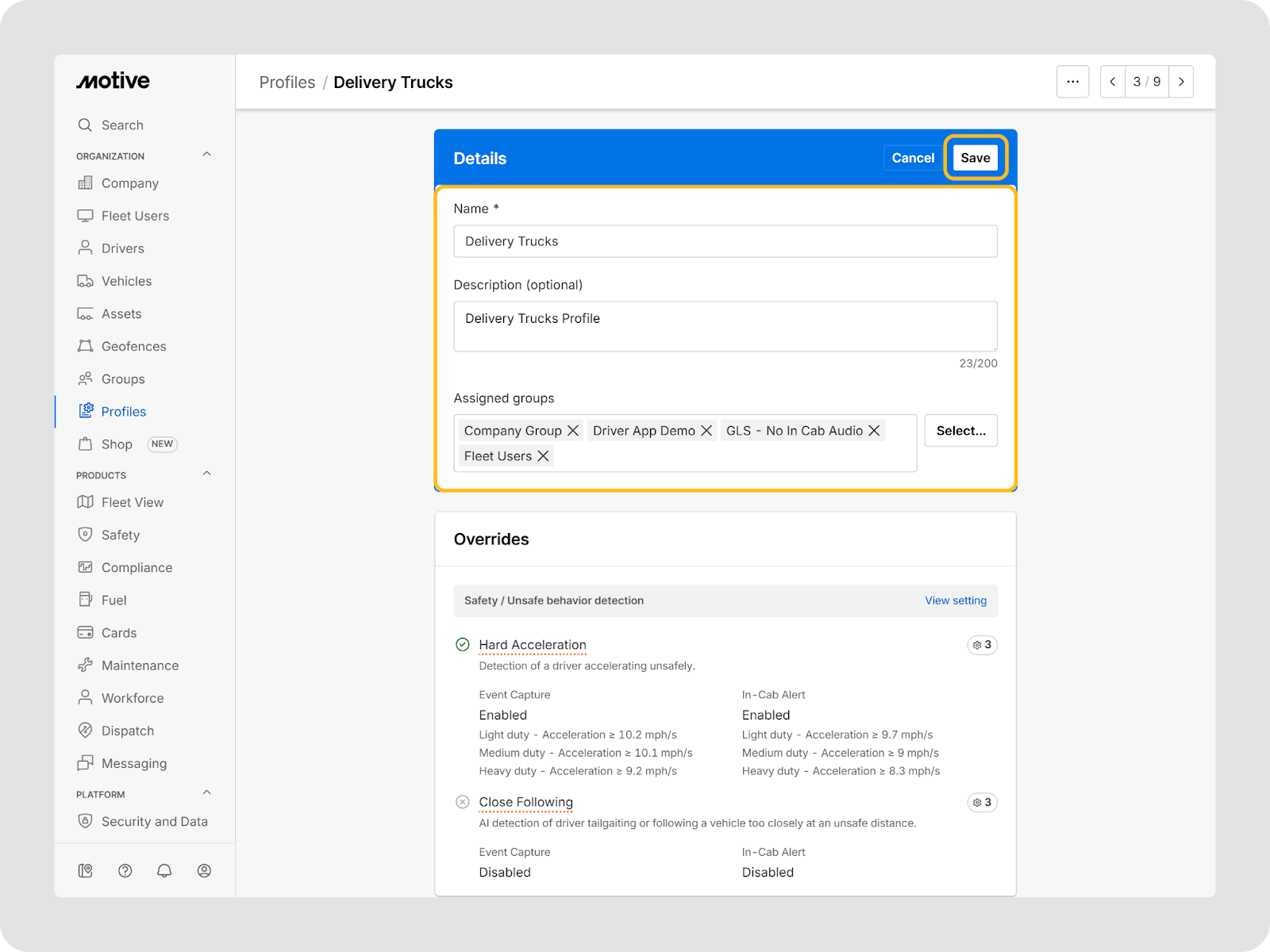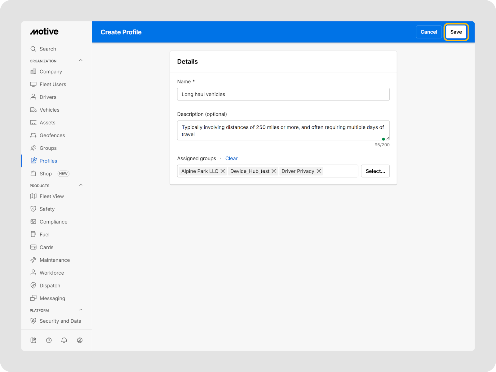 Chaque profil peut être attribué à un ou plusieurs groupes au sein de votre flotte. Par exemple, si les administrateurs de flotte ont trois groupes différents de camions longue distance, ils peuvent créer un profil camion longue distance avec des configurations de sécurité spécifiques et l’appliquer à ces groupes.