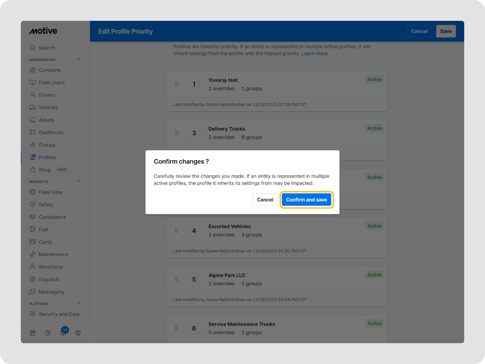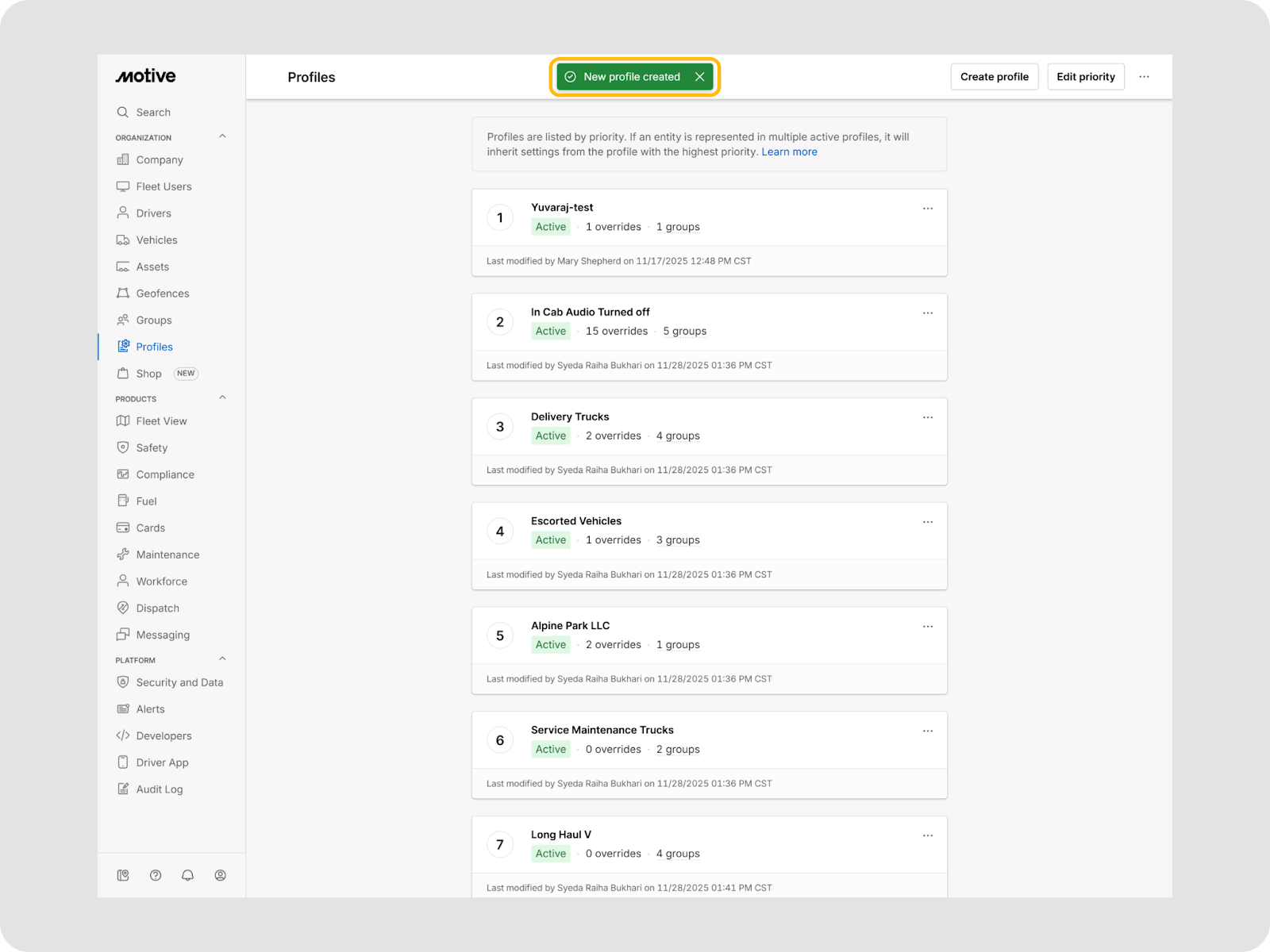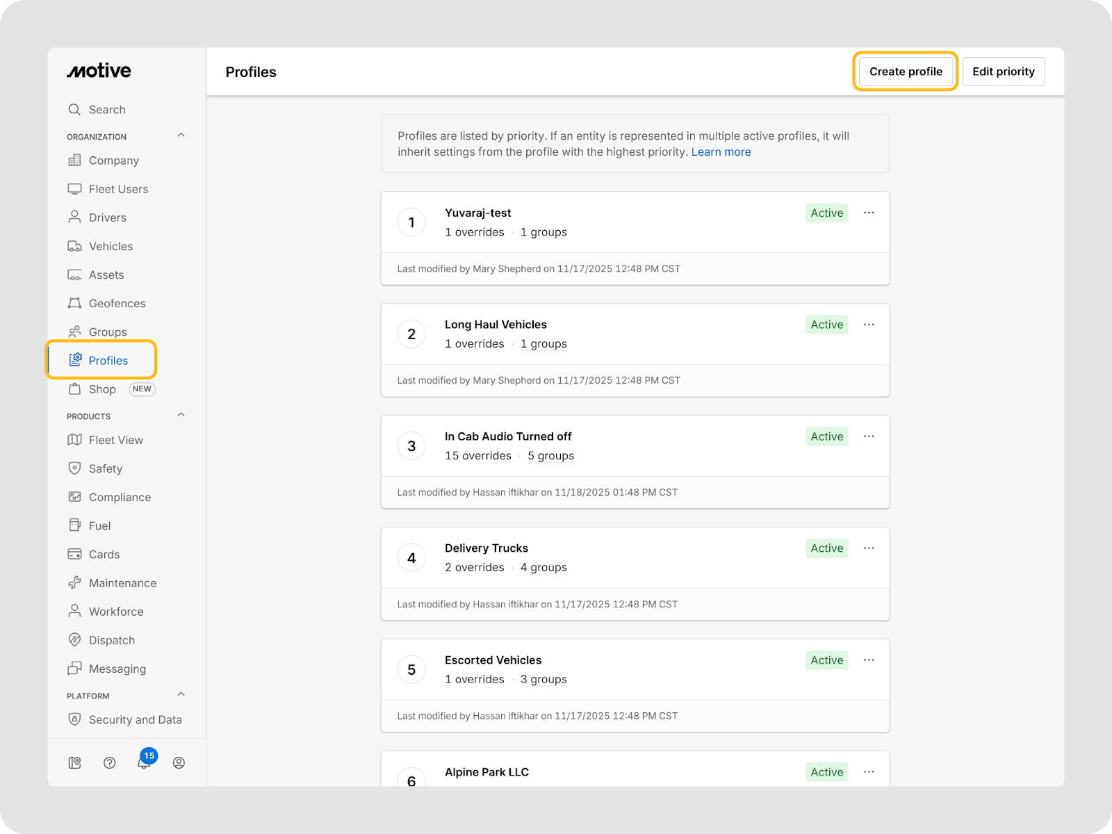 Lorsque plusieurs profils sont attribués aux mêmes groupes, Motive utilise l’ordre de priorité pour déterminer quels paramètres de profil s’appliquent lorsque des véhicules sont associés à plus d’un de ces profils. Chaque profil se voit attribuer un numéro de priorité, les numéros les plus bas ayant préséance sur les plus élevés.