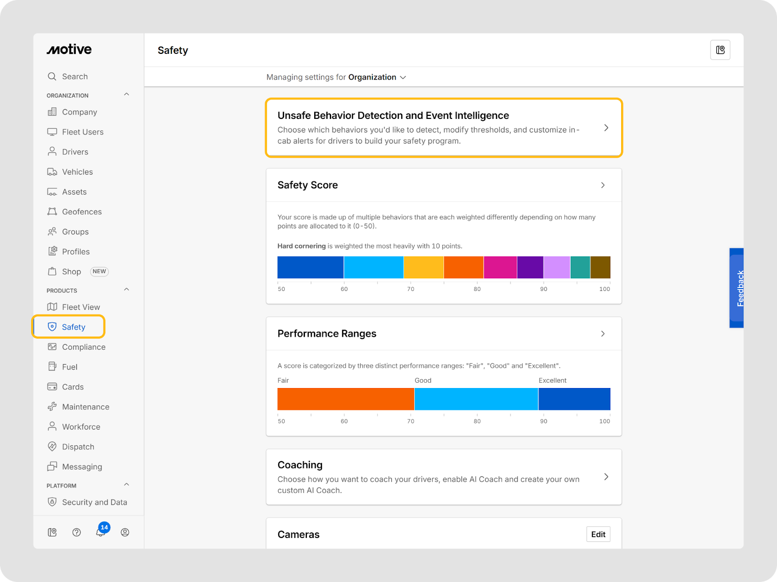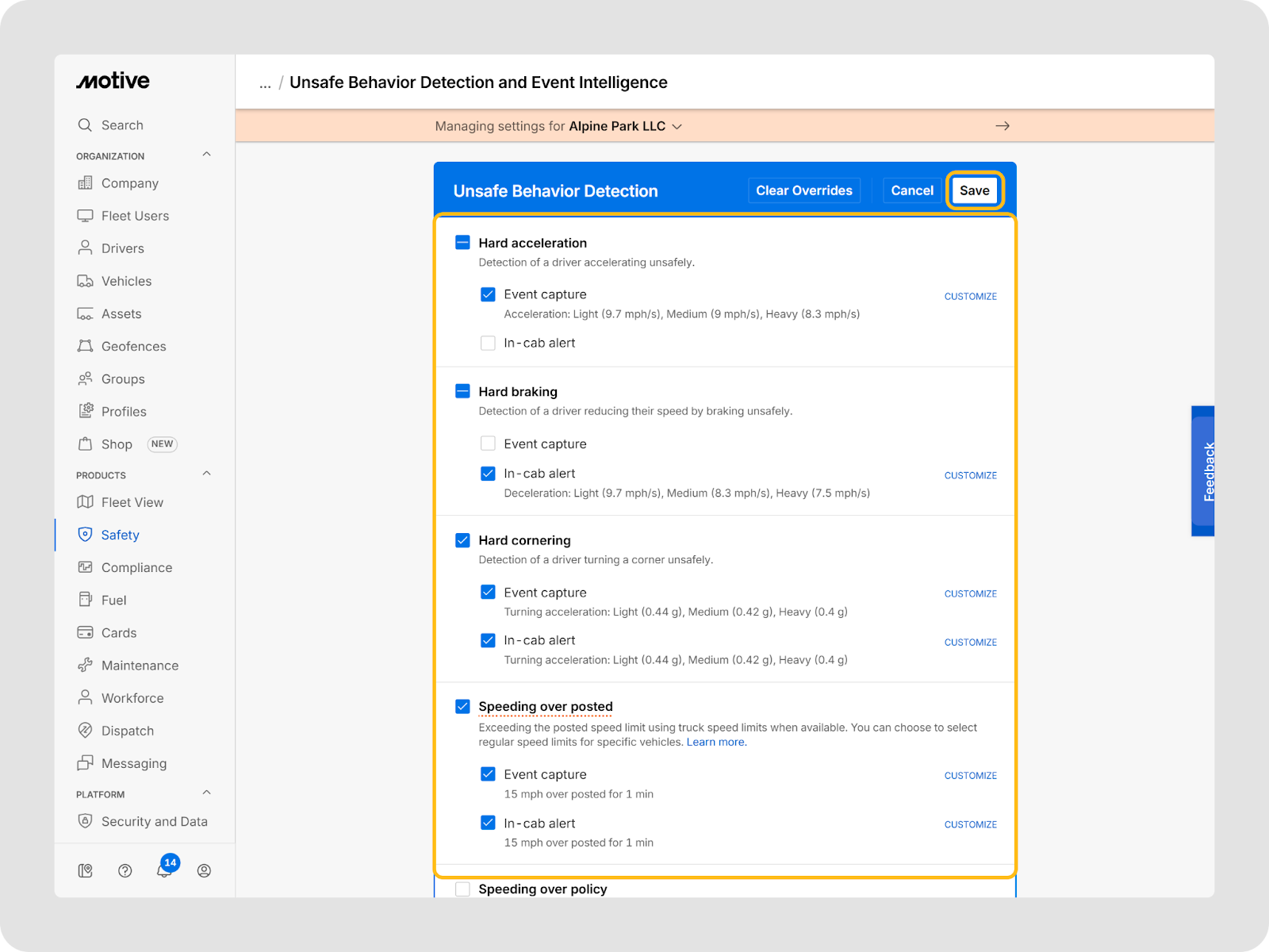 Motive permet aux administrateurs de flotte d’appliquer des paramètres au niveau de l’entreprise pour tous les véhicules ou uniquement aux véhicules appartenant à des groupes spécifiques. Pour chaque cas, il suffit de s’assurer que la bonne sélection est faite sur chaque page de paramètres à l’aide de la bannière supérieure (illustrée ci-dessous).