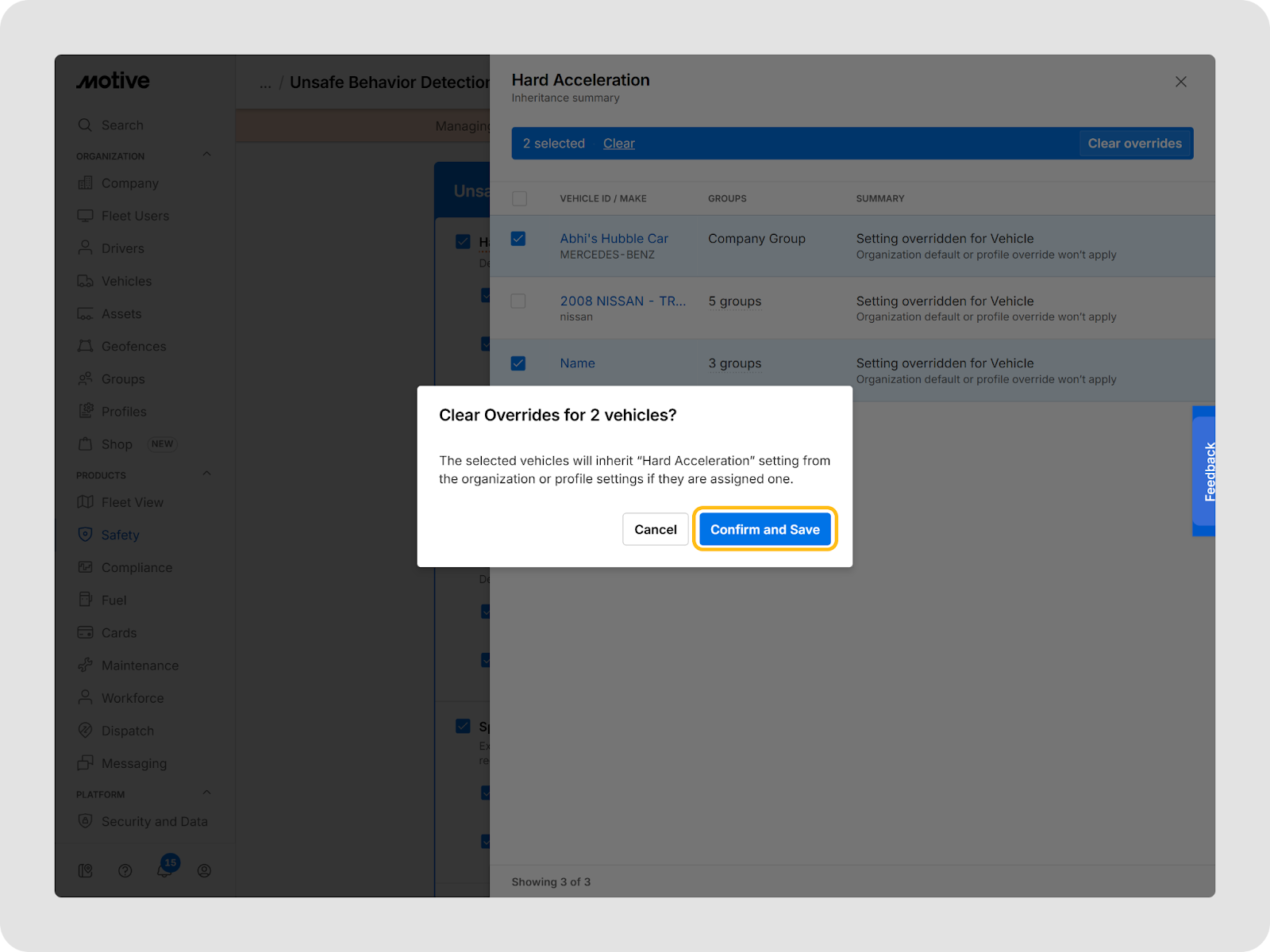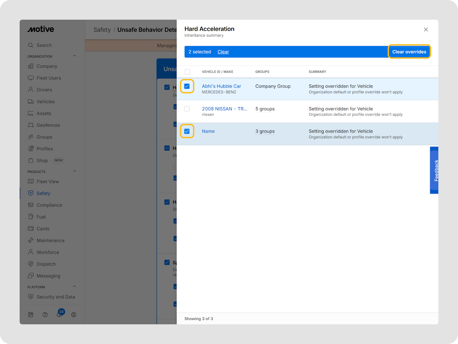 6. Une liste de véhicules avec des paramètres remplacés à partir du profil sélectionné apparaît. Sélectionnez les véhicules pour lesquels vous souhaitez effacer les remplacements en cochant les cases à côté d’eux.