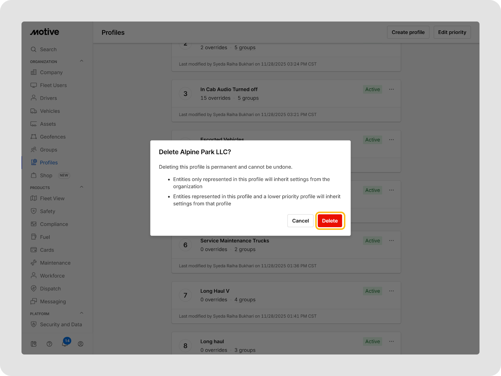 | Remarque : Si un véhicule est lié à plus d’un profil, le profil ayant la priorité la plus élevée déterminera quels paramètres le véhicule utilisera. Par exemple, si un Ford F-150 fait partie à la fois des profils « Alpine Parks LLC » et « Camions de livraison », et que « Camions de livraison » a une priorité plus élevée, le camion suivra les paramètres de « Camions de livraison ». |