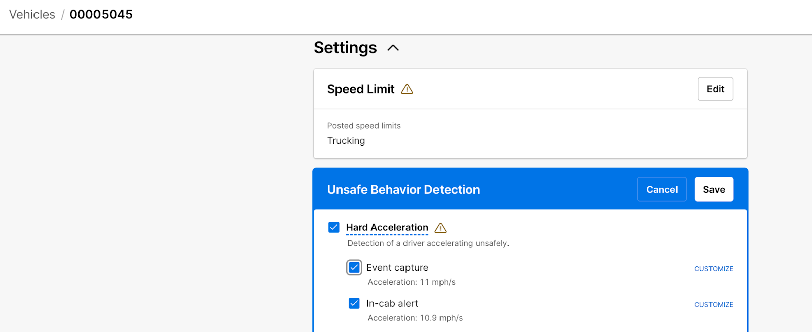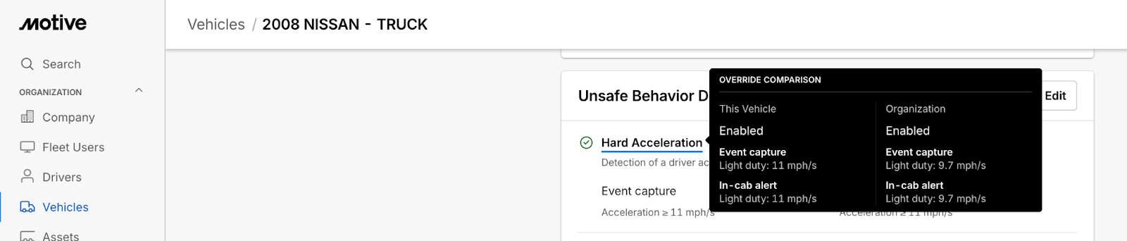 Des profils de véhicules individuels peuvent être créés et maintenus afin d’appliquer des paramètres associés à la sécurité. Par exemple, les administrateurs de flotte peuvent modifier le profil administrateur d’un véhicule pour activer ou désactiver l’accélération brusque et déterminer si ce comportement déclenche des événements de sécurité et joue des alertes audio en cabine lorsqu’un conducteur accélère brusquement.