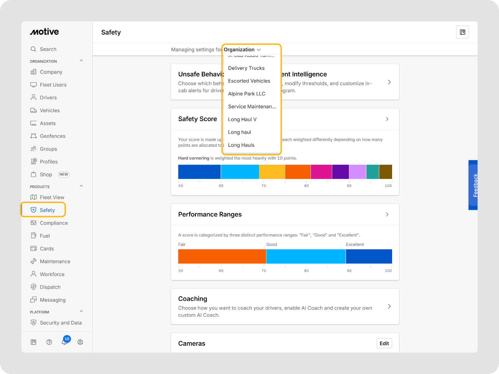 Les paramètres au niveau du groupe dans Motive permettent aux administrateurs de flotte de configurer et d’appliquer des paramètres de sécurité tels que les comportements dangereux, les configurations de caméras embarquées et les paramètres de confidentialité des conducteurs à l’échelle d’un groupe au sein de leur organisation. Ces paramètres garantissent que les politiques à l’échelle de la flotte peuvent être appliquées efficacement tout en offrant de la flexibilité pour des groupes spécifiques de véhicules.