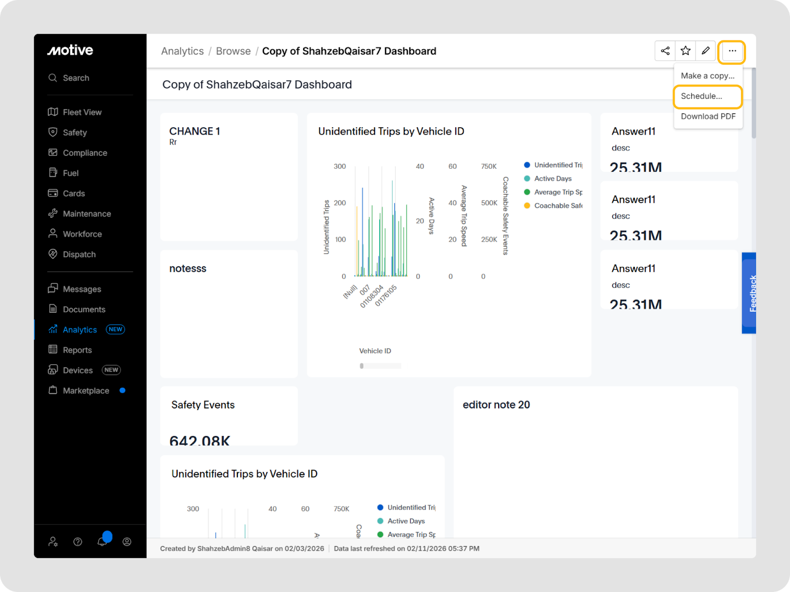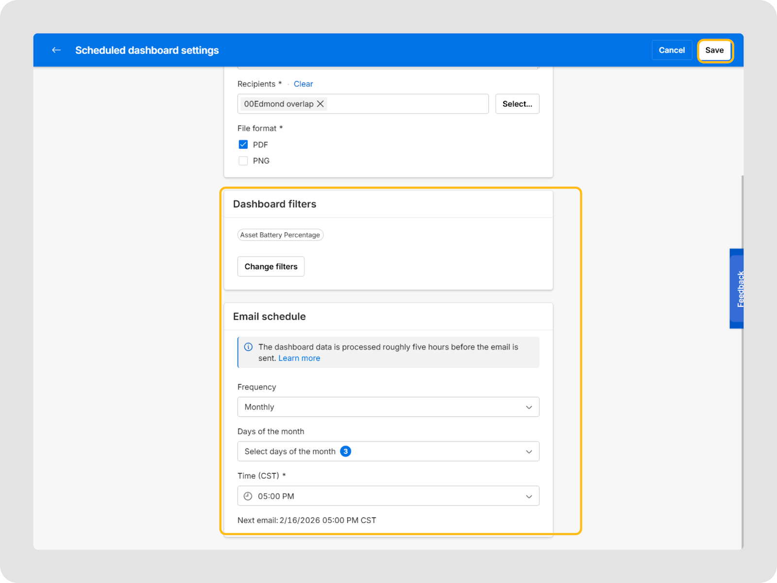 - Livrez les tableaux de bord par courriel sous forme de pièces jointes PDF ou PNG, permettant aux destinataires d’accéder aux informations sans se connecter à la plateforme Motive.