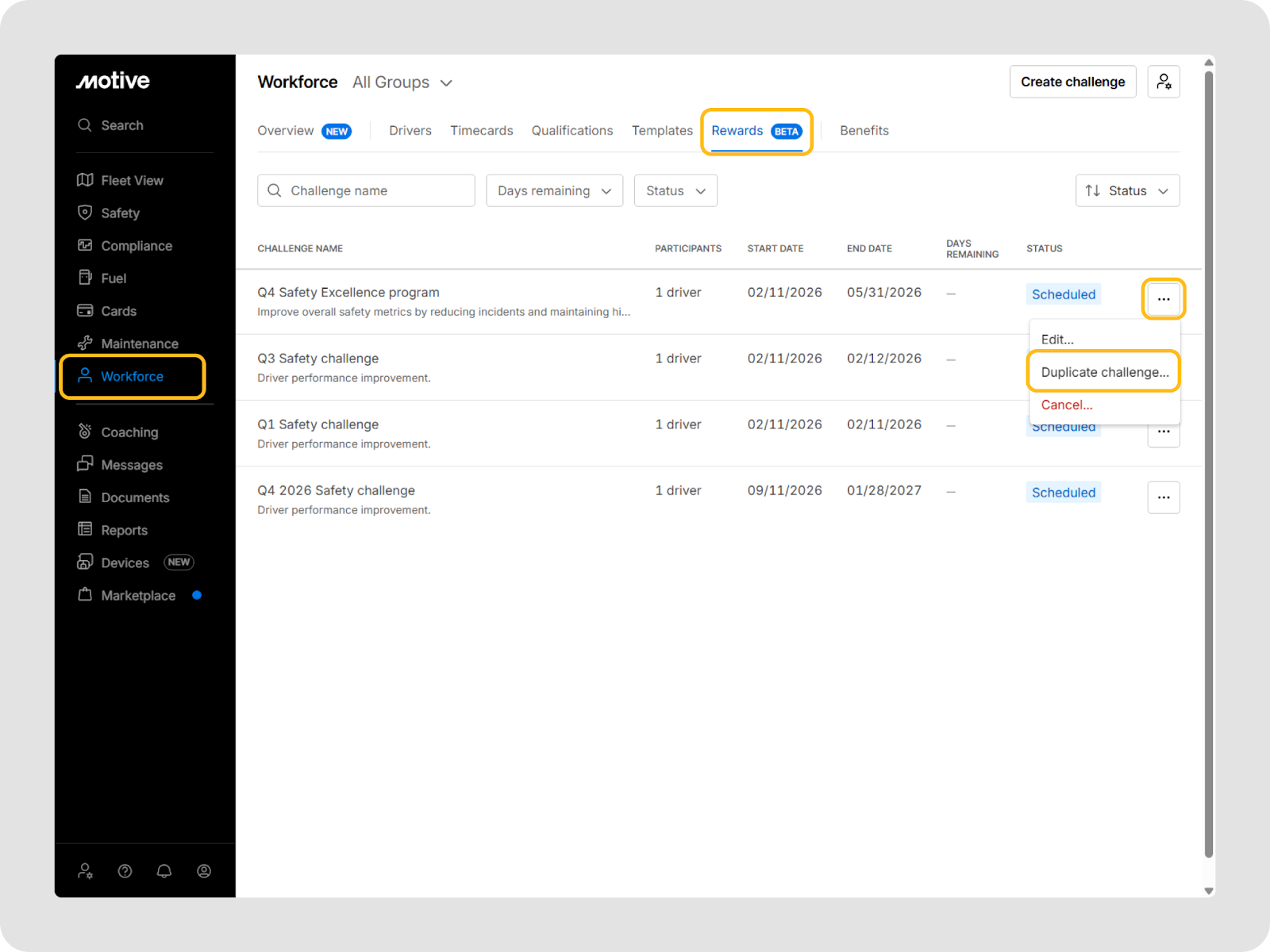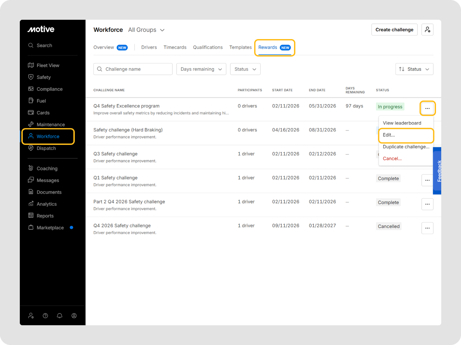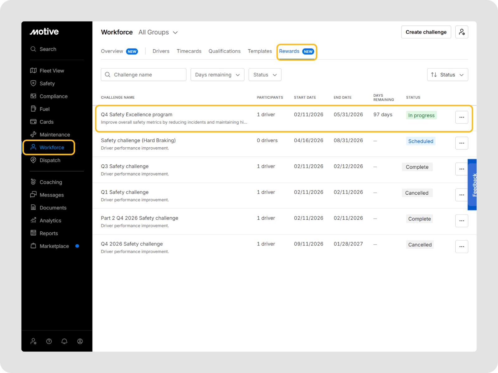 Vous pouvez aller à Main-d'œuvre > Récompenses dans le tableau de bord de flotte Motive pour voir et gérer tous les défis.