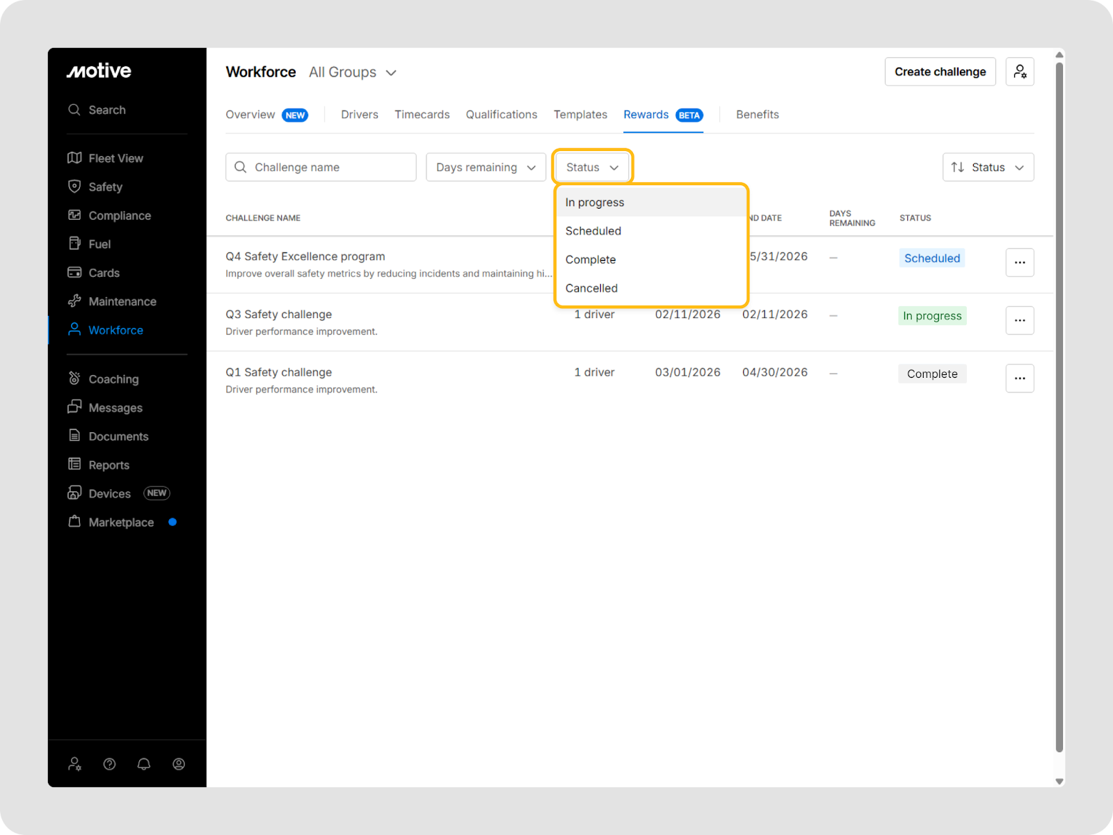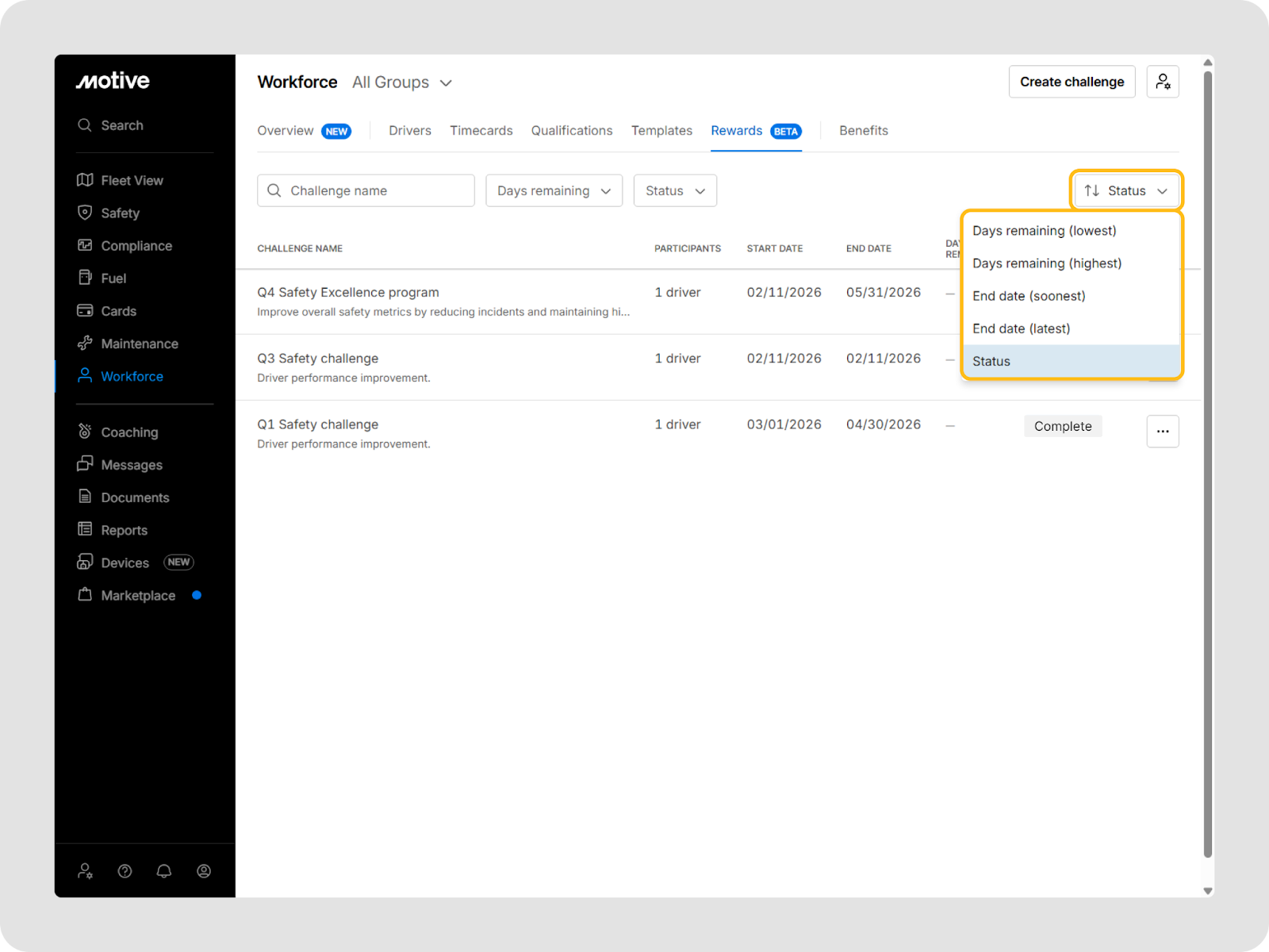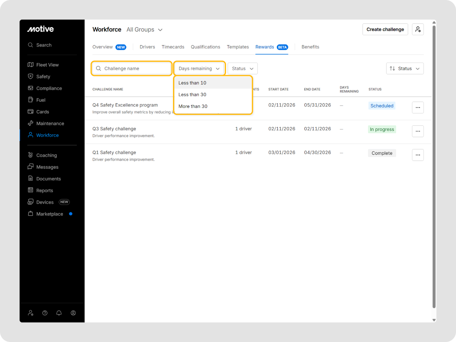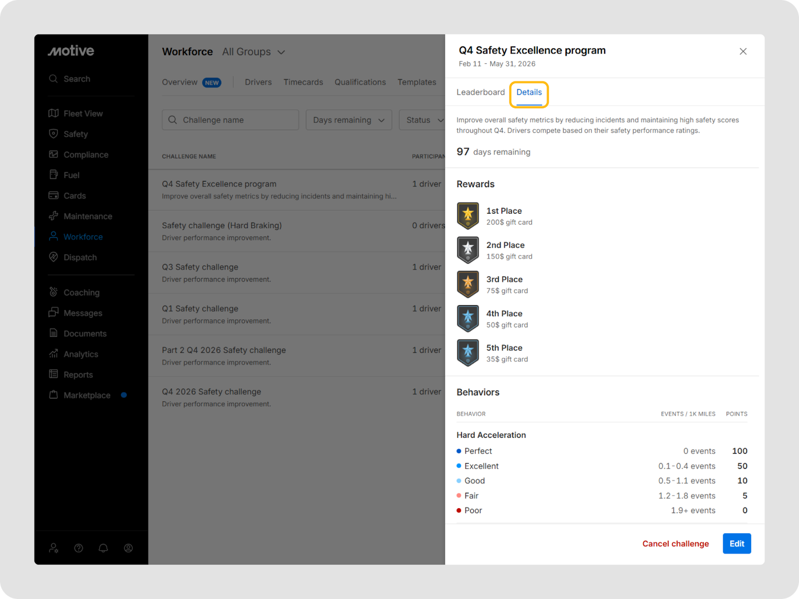 Vous pouvez aller à Main-d'œuvre > Récompenses dans le tableau de bord de flotte Motive pour voir et gérer tous les défis.