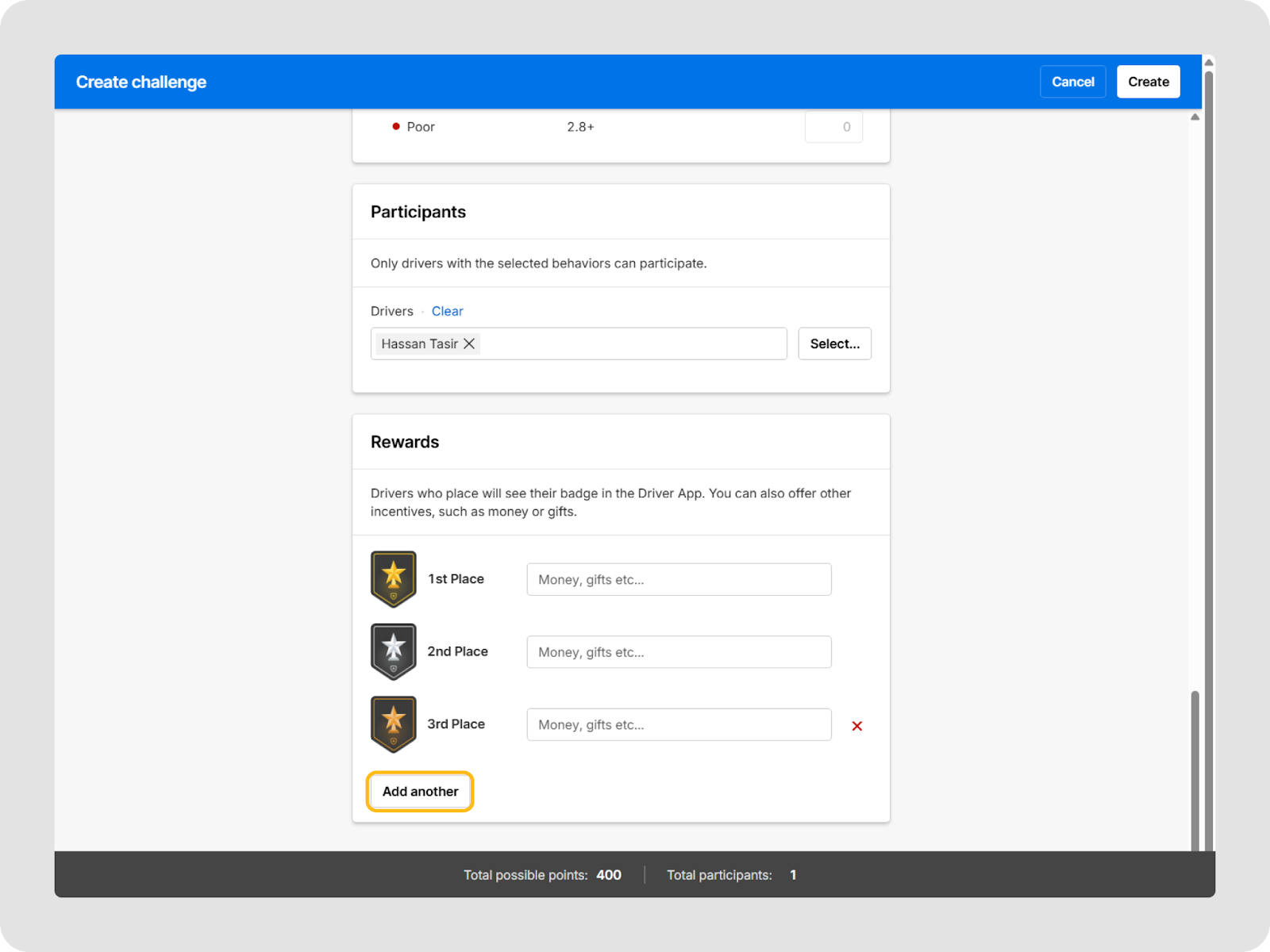 - Récompenses basées sur le classement : Configurez des récompenses selon le classement (par exemple, prix pour la 1re, 2e et 3e place) avec des descriptions claires des prix afin que les conducteurs sachent exactement ce qu’ils visent. Les récompenses doivent être attribuées et distribuées en dehors de la plateforme Motive.
