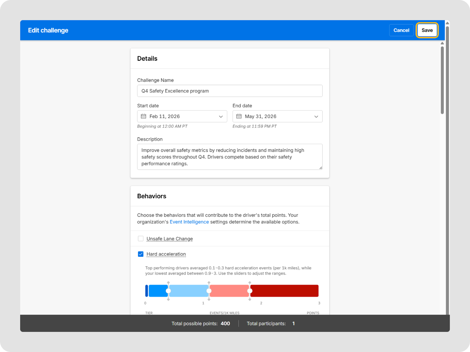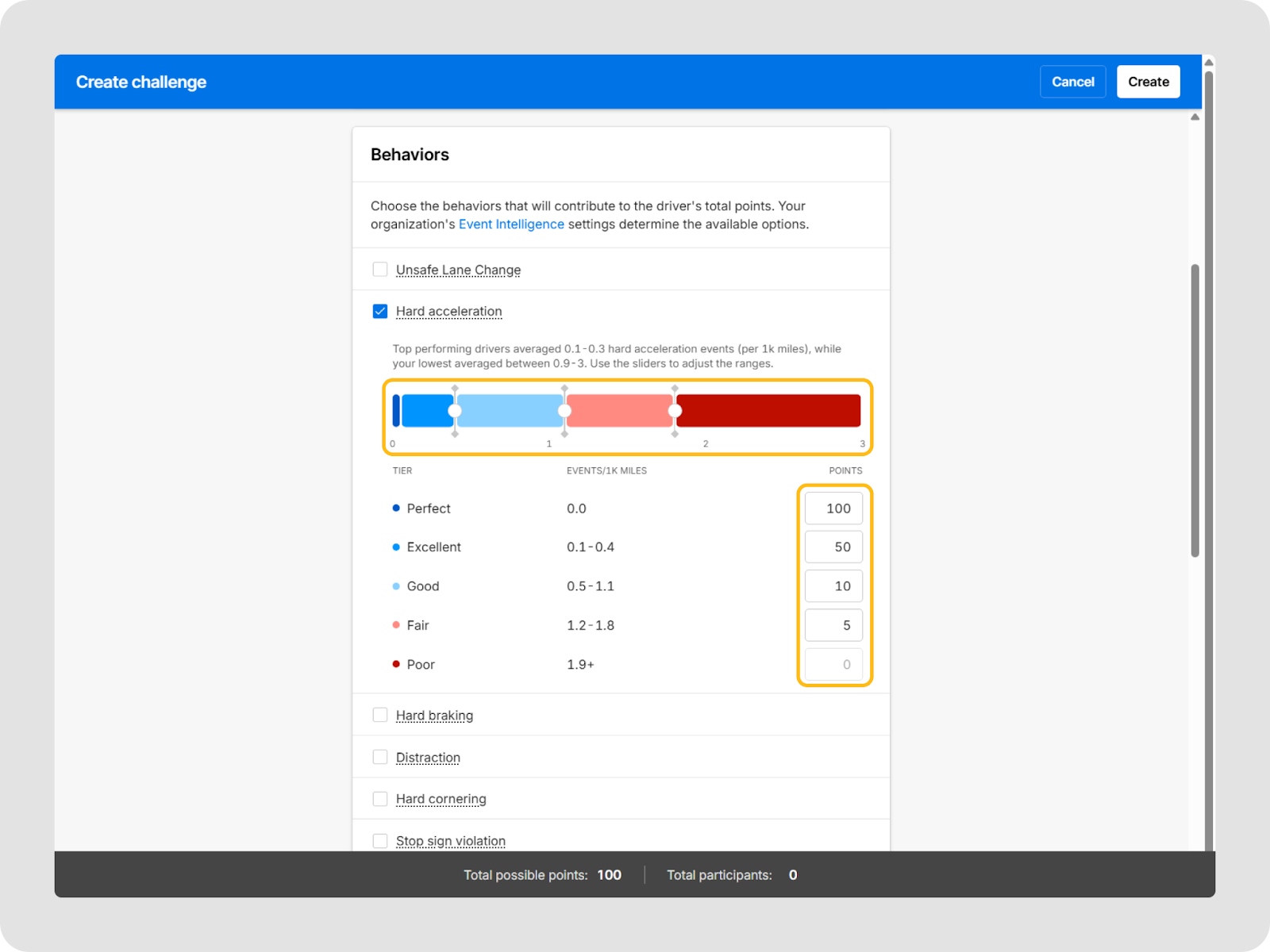 - Évaluation basée sur les comportements : Choisissez parmi des comportements prédéfinis (tels que l’accélération brusque, l’excès de vitesse, l’utilisation de la ceinture de sécurité et l’utilisation du téléphone cellulaire) et configurez des niveaux et seuils de points afin que les conducteurs gagnent des points pour avoir respecté les normes établies.