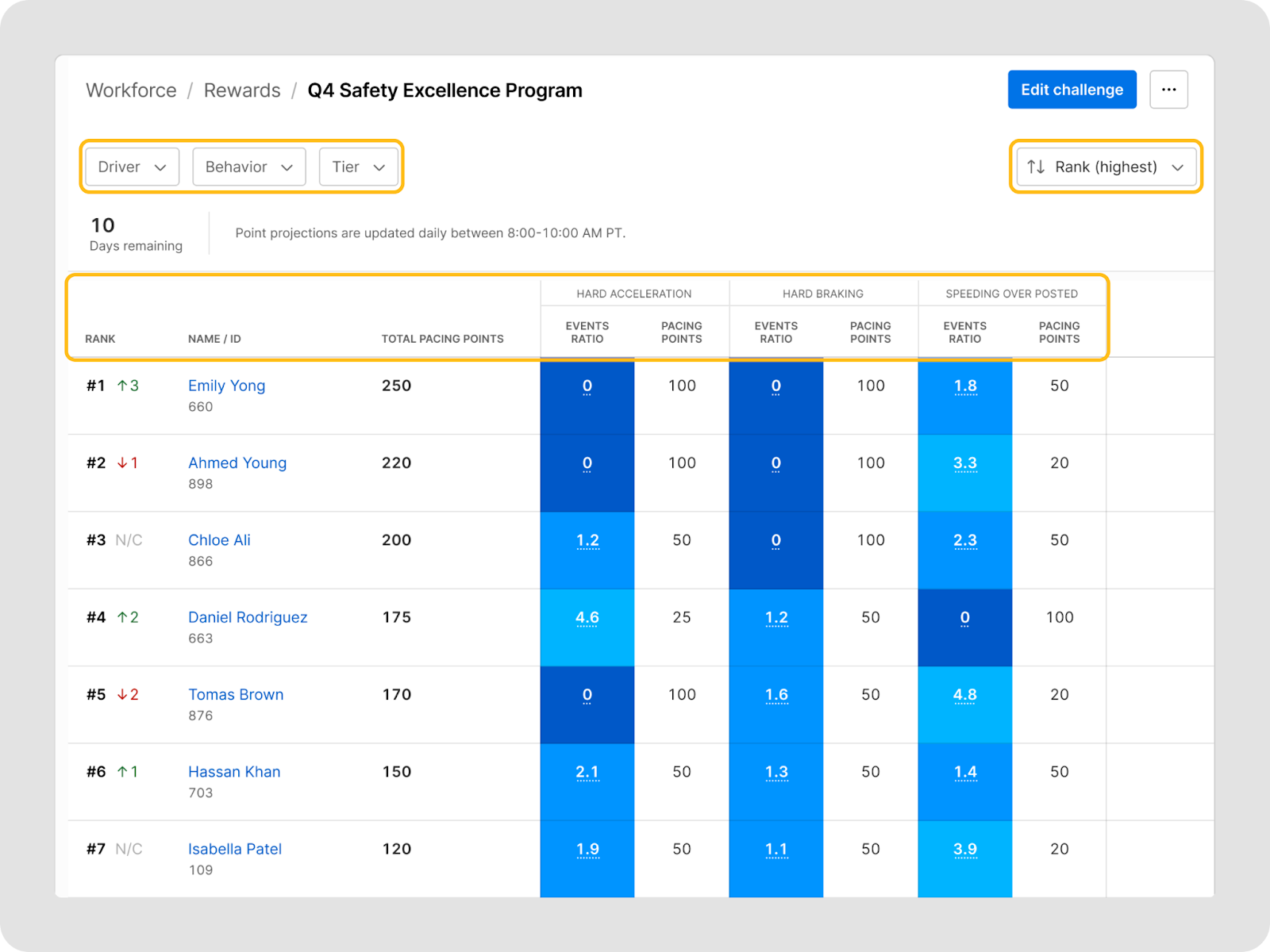 Vous pouvez consulter le tableau de classement d’un défi en cours ou terminé pour voir le rang, les points et la ventilation des scores de chaque conducteur.