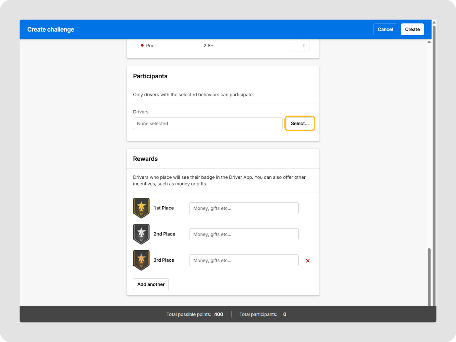 - Participation ciblée : Ajoutez des conducteurs spécifiques ou des groupes de conducteurs à chaque défi afin de concentrer les programmes sur certains terminaux, régions ou segments de votre flotte.