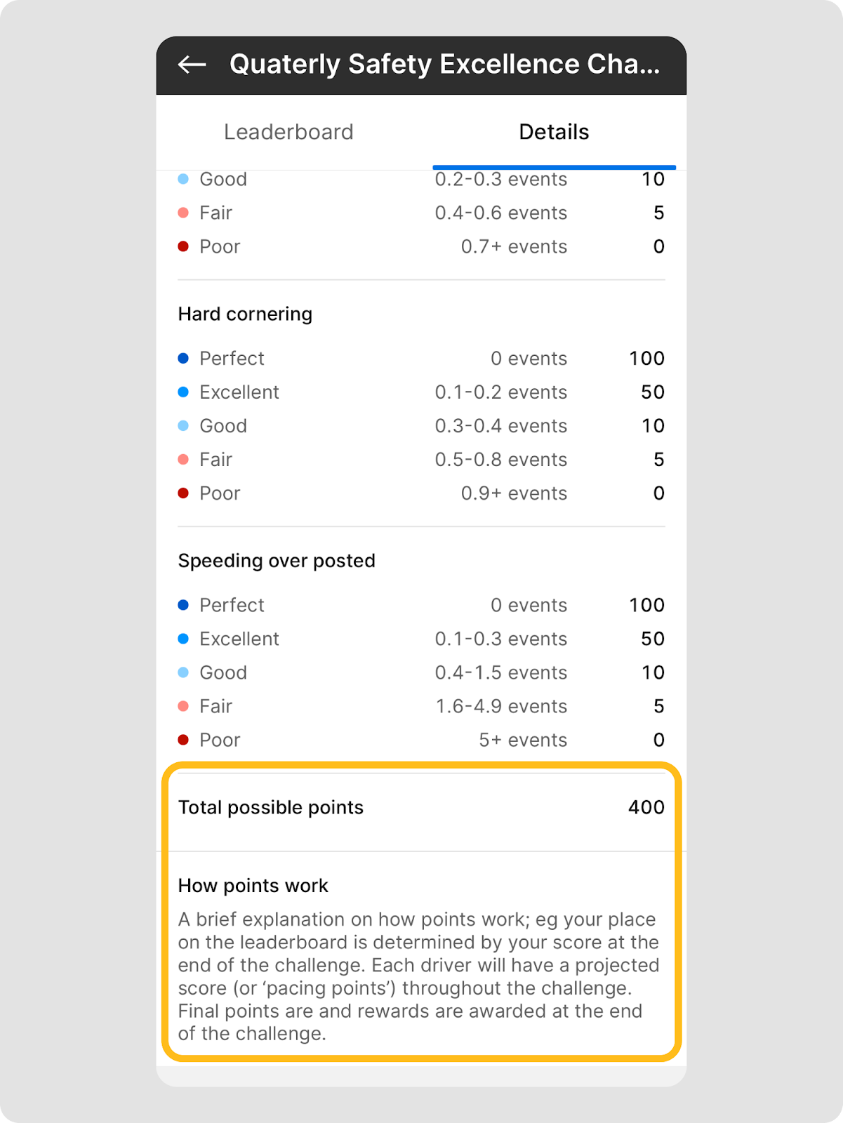 En ouvrant un défi et en consultant la répartition des points par comportement, un conducteur peut voir comment différents comportements de conduite (comme la vitesse excessive ou l’accélération brusque) contribuent au score total.