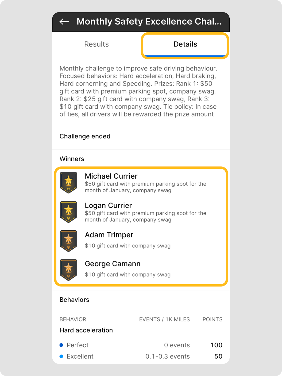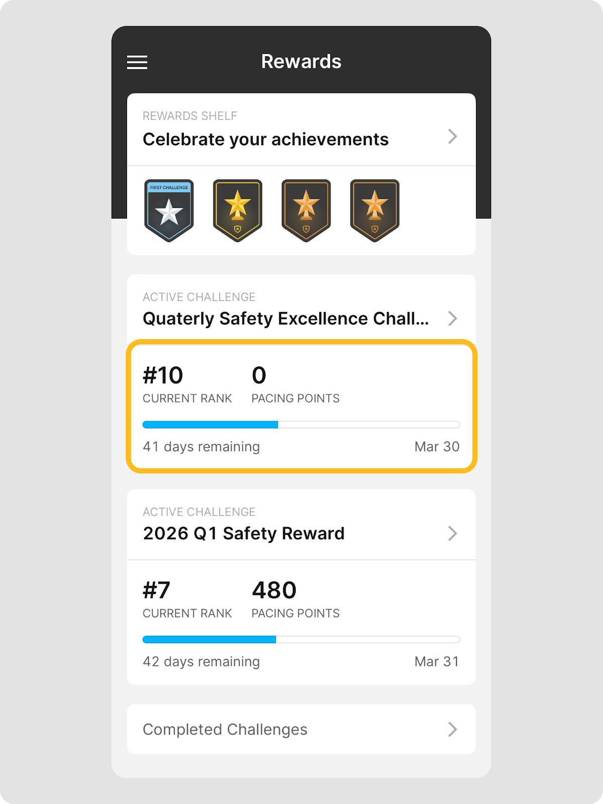 La fonctionnalité Récompenses dans l’application Motive Driver permet aux conducteurs de voir tous leurs défis terminés, actifs et à venir au même endroit. Pour chaque défi terminé ou actif, les conducteurs peuvent consulter le classement et suivre leur rang, la répartition de leurs points et les badges obtenus. Cela aide les conducteurs à comprendre exactement comment leur comportement de conduite se traduit en points, classements et récompenses.