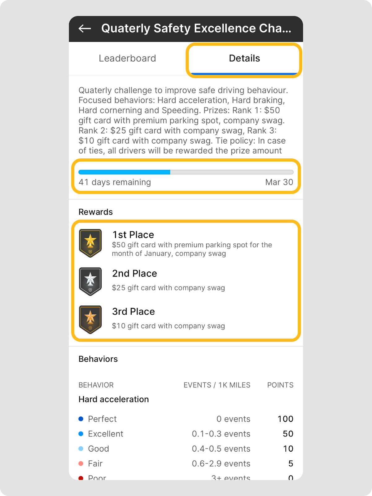 L’onglet Récompenses de l’application Driver permet aux conducteurs de surveiller les classements et leur performance dans chaque défi.