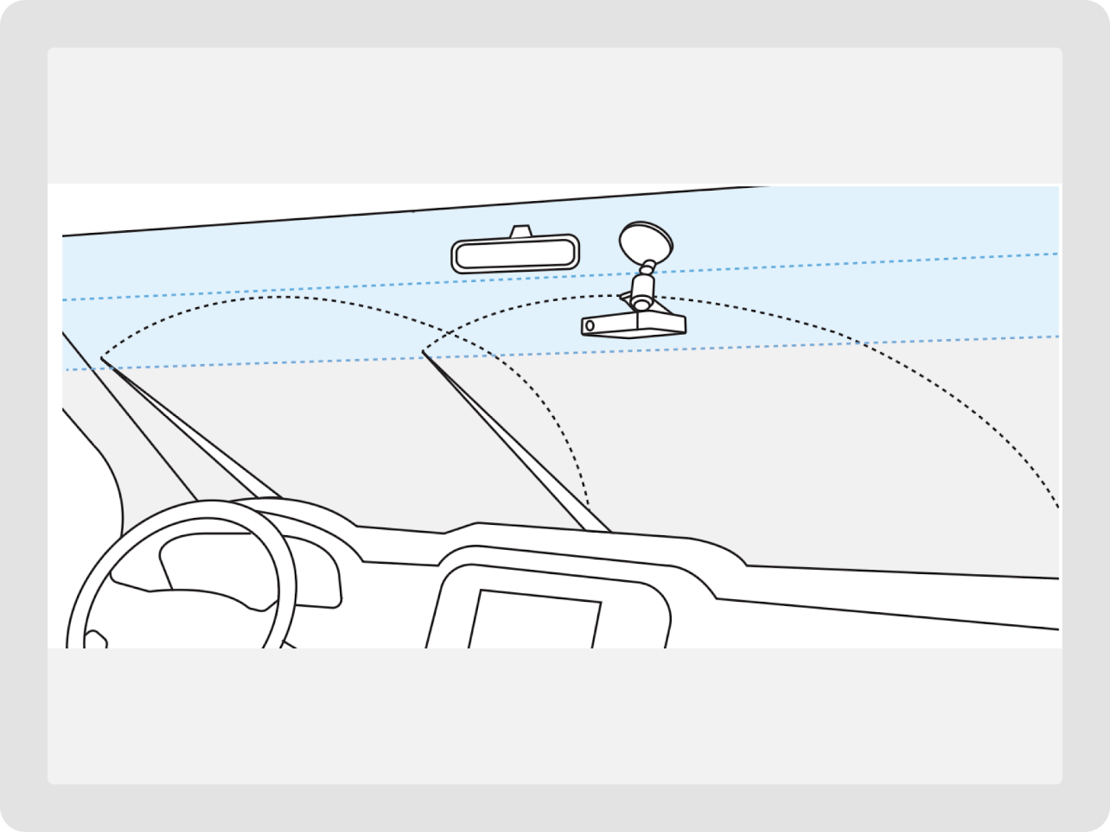 - Emplacement de montage supérieur (recommandé) : Positionnez la dashcam à moins de 216 mm (8,5 pouces) sous le bord supérieur de la zone balayée par les essuie-glaces. Pour la plupart des véhicules, l'emplacement optimal est de l'installer sur le côté droit juste derrière le rétroviseur.